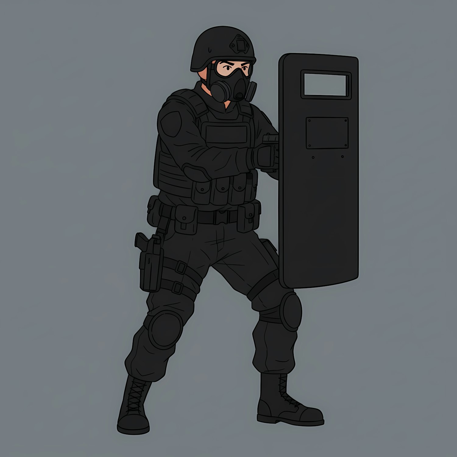 Illustration of a tactical officer in black gear with a riot shield, set against a plain gray background.