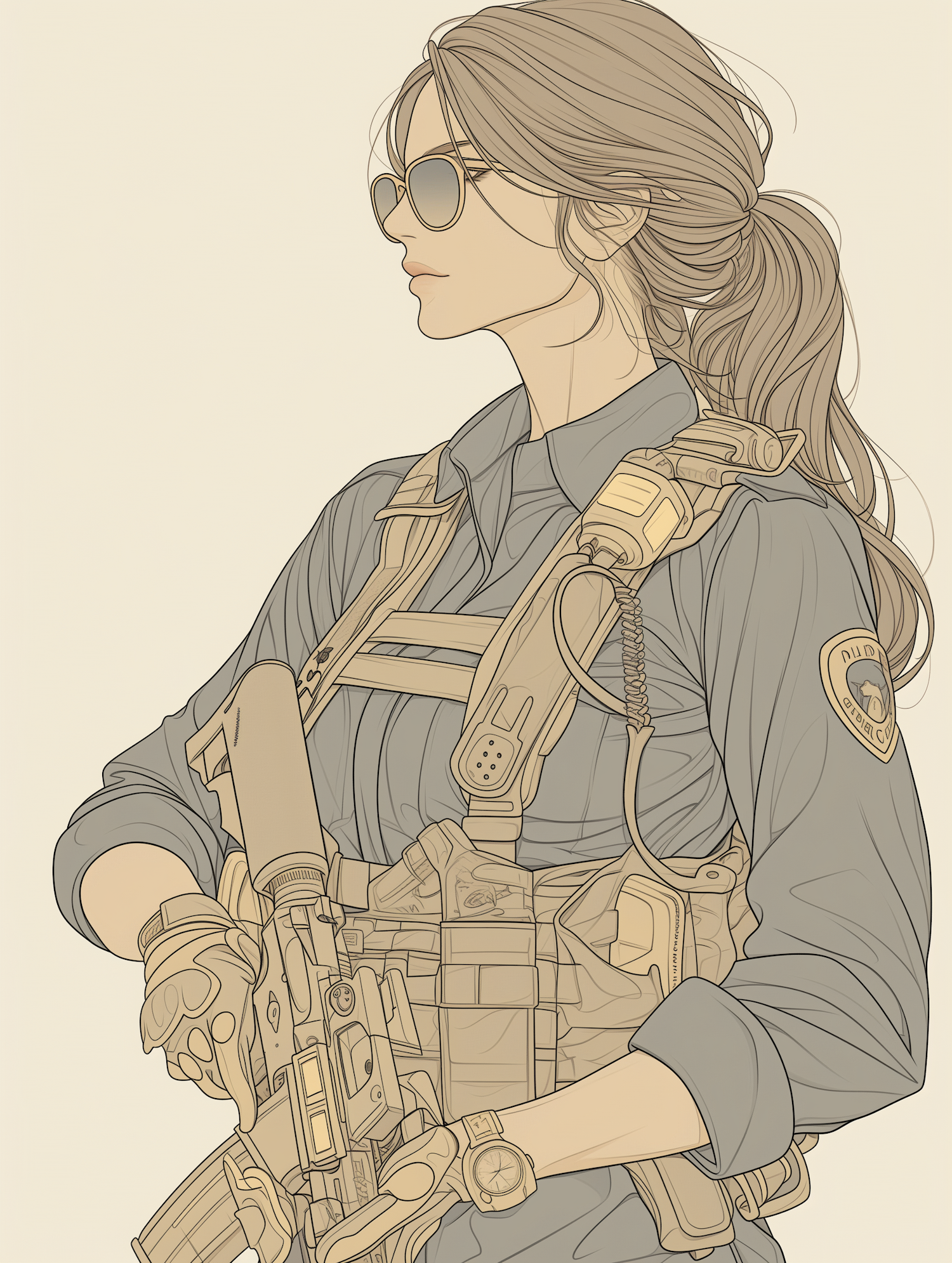 Stylized illustration of a woman in tactical gear holding a rifle, with sunglasses and a ponytail, in muted beige tones.