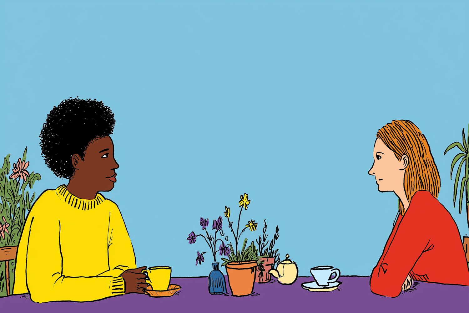 Two people sit at a table with tea and plants, engaging in conversation against a light blue background.