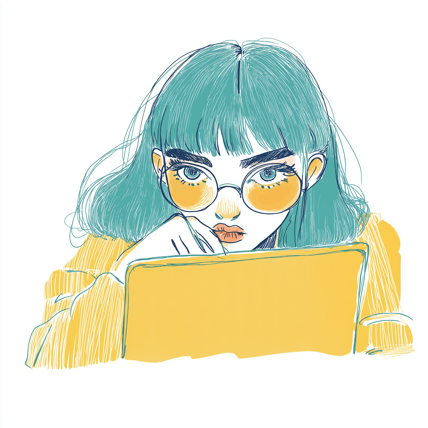 Stylized illustration of a person with teal hair and yellow glasses, focused on a yellow laptop. Modern and cohesive color palette.