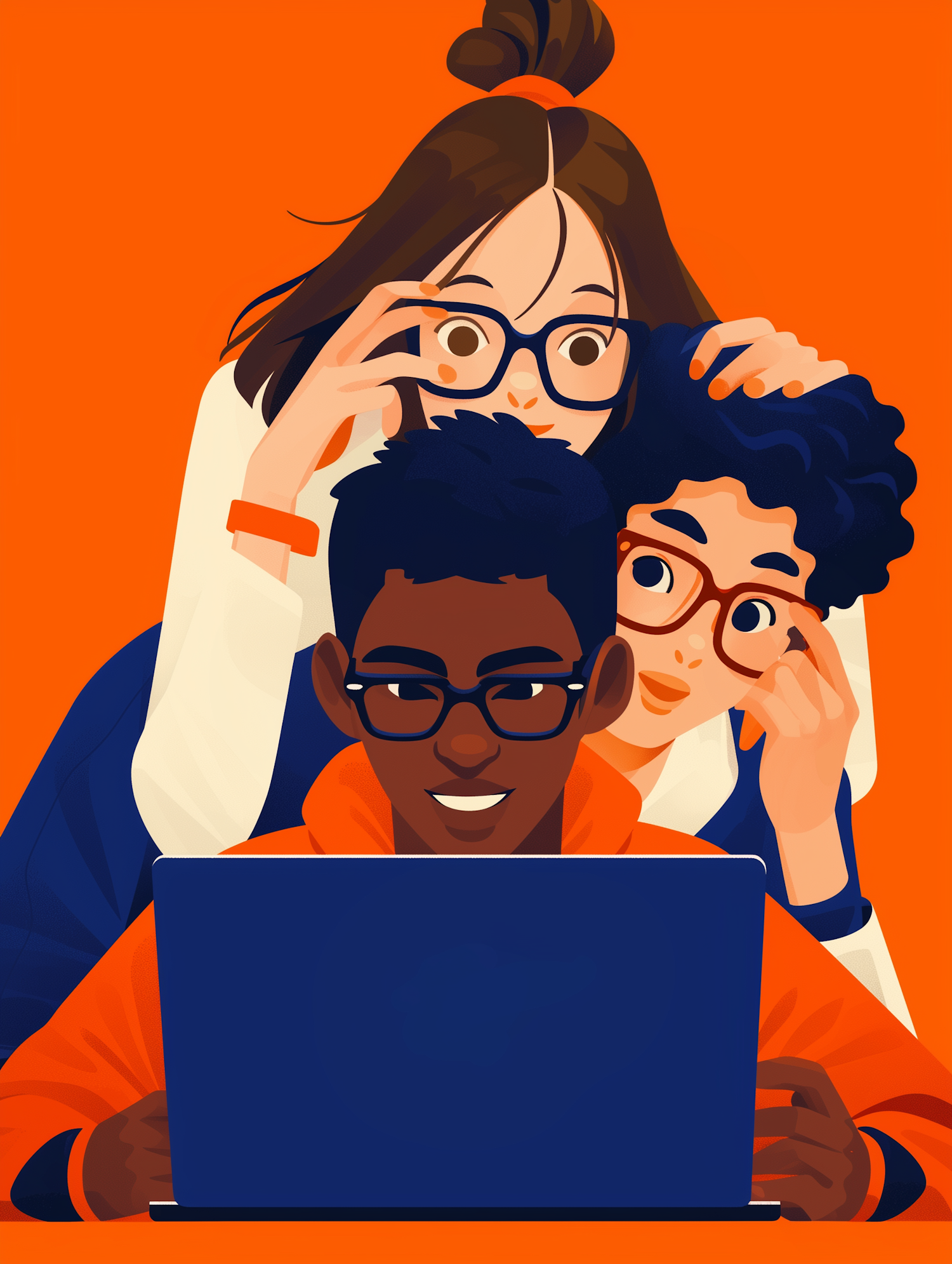 Three diverse friends excitedly gather around a laptop, sharing a moment of curiosity and collaboration on a bold orange background.