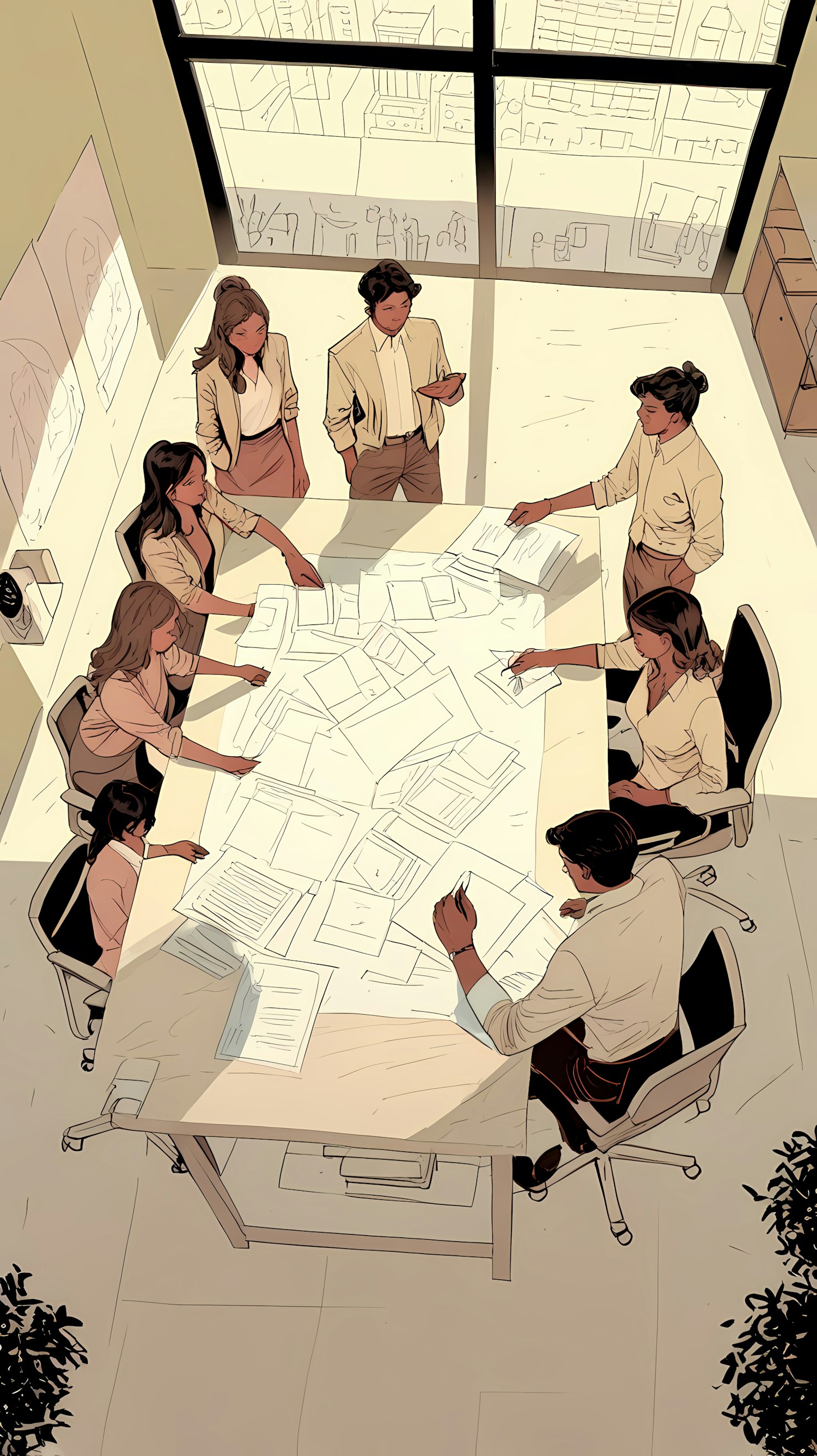 Diverse office team collaborating on documents around a modern table, bright office light enhances the professional atmosphere.