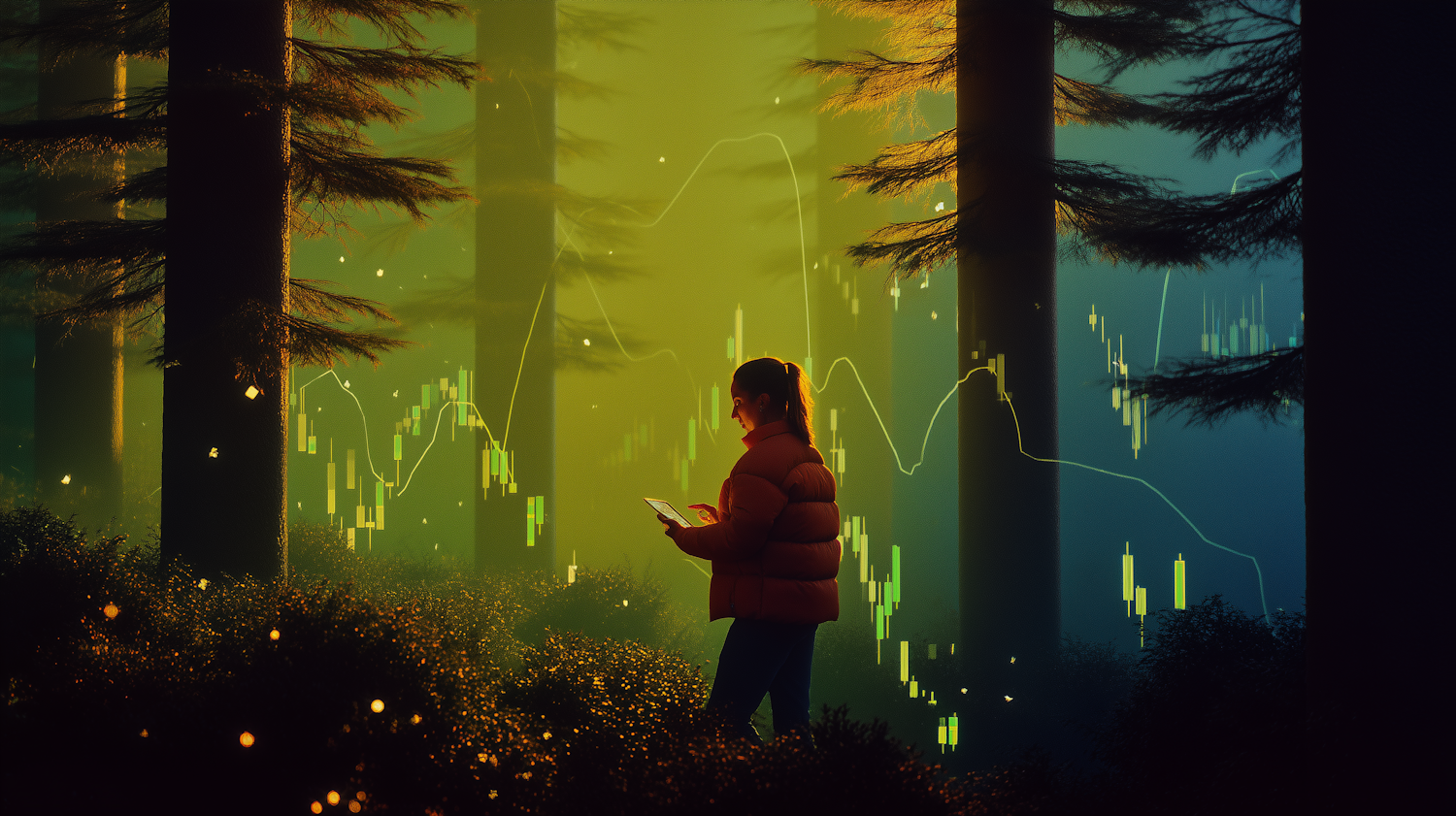 A person in a forest interacts with a tablet, surrounded by glowing financial graphs, blending nature and technology in a surreal scene.