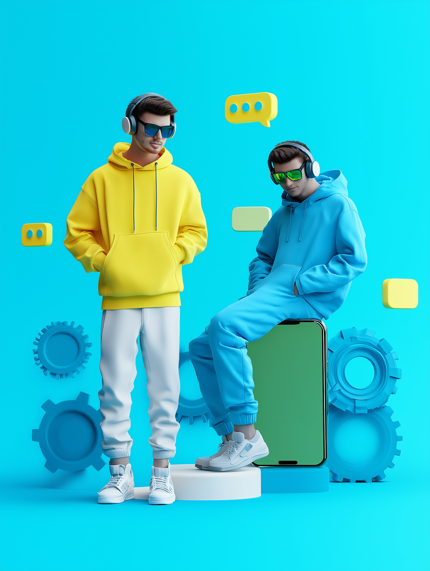 Two animated characters in colorful hoodies with headphones and sunglasses, surrounded by 3D gears and chat bubbles on a blue background.