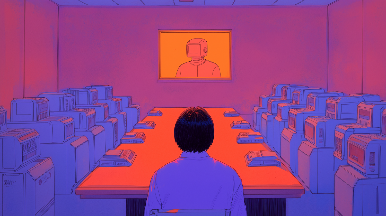 A person sits in a room filled with vintage computers, facing a screen with a humanoid figure. Retro-futuristic vibes in purple and red hues.
