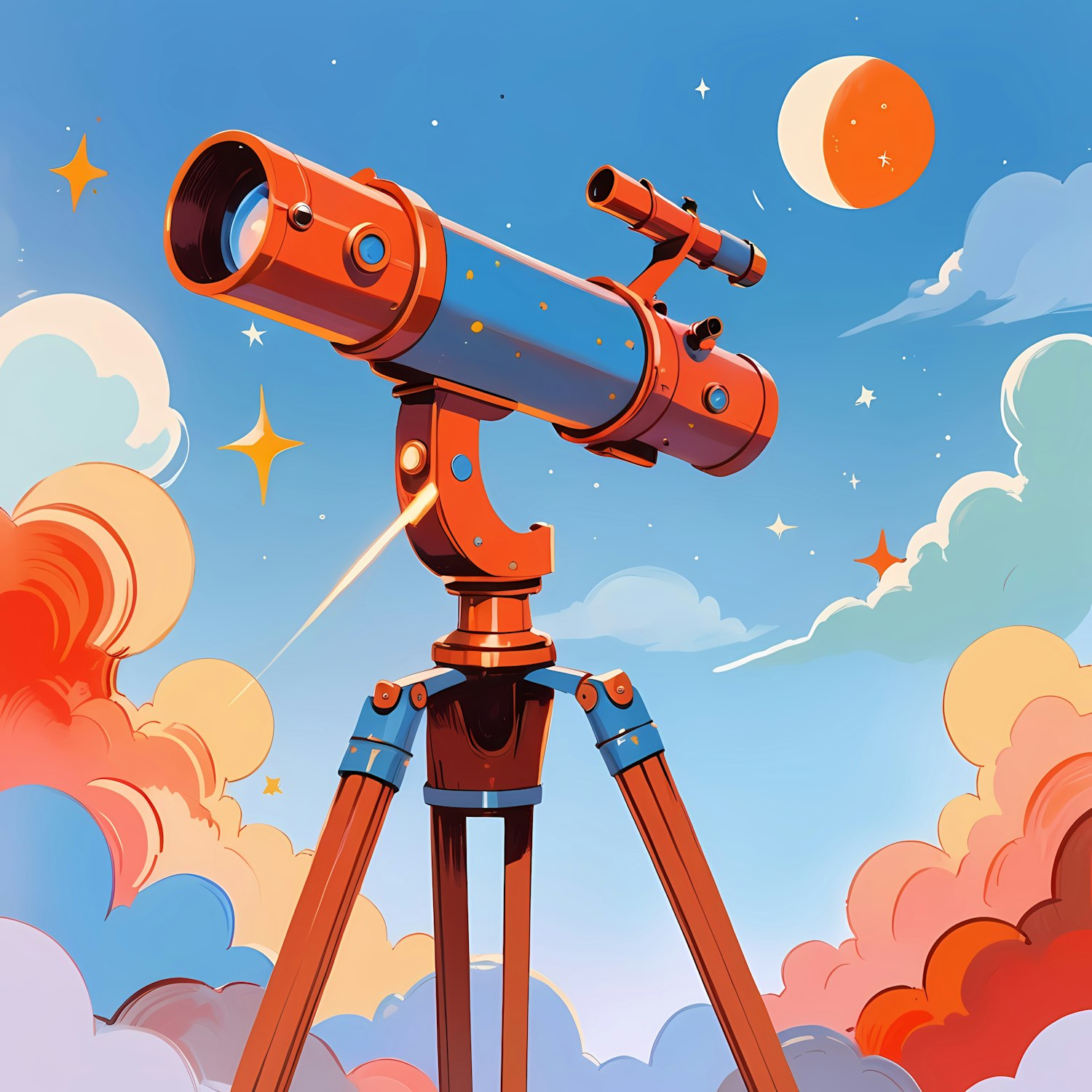 Whimsical illustration of a colorful telescope under a dreamy sky with stars, clouds, and a crescent moon. Perfect for stargazing themes.