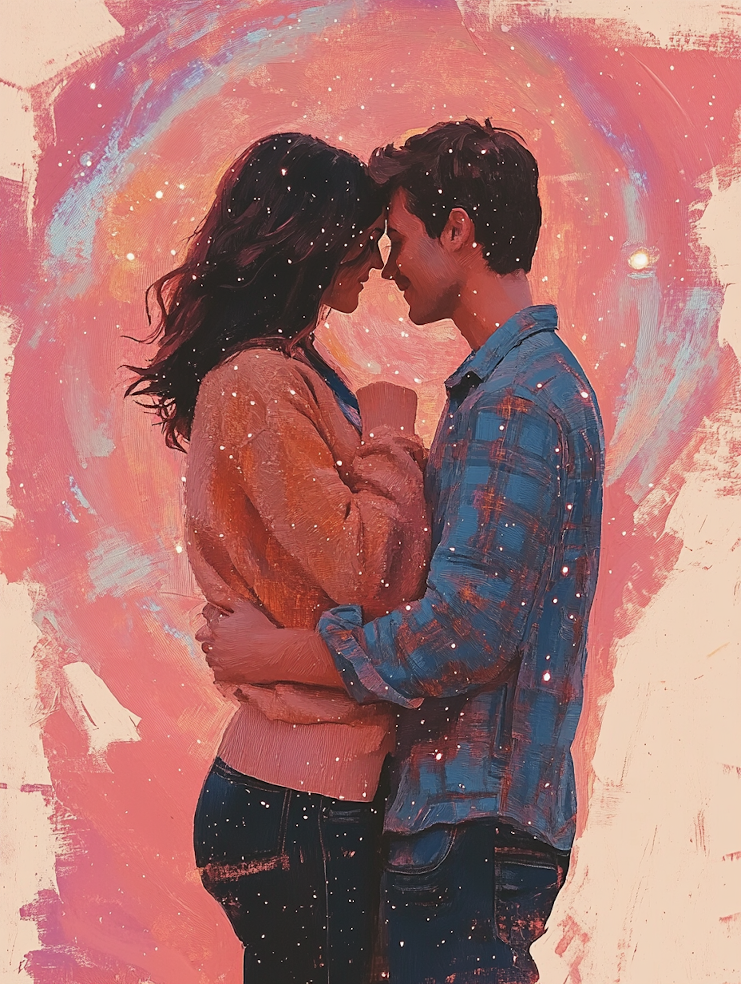 Romantic illustration of a couple embracing with a dreamy, cosmic background in pink and orange hues.