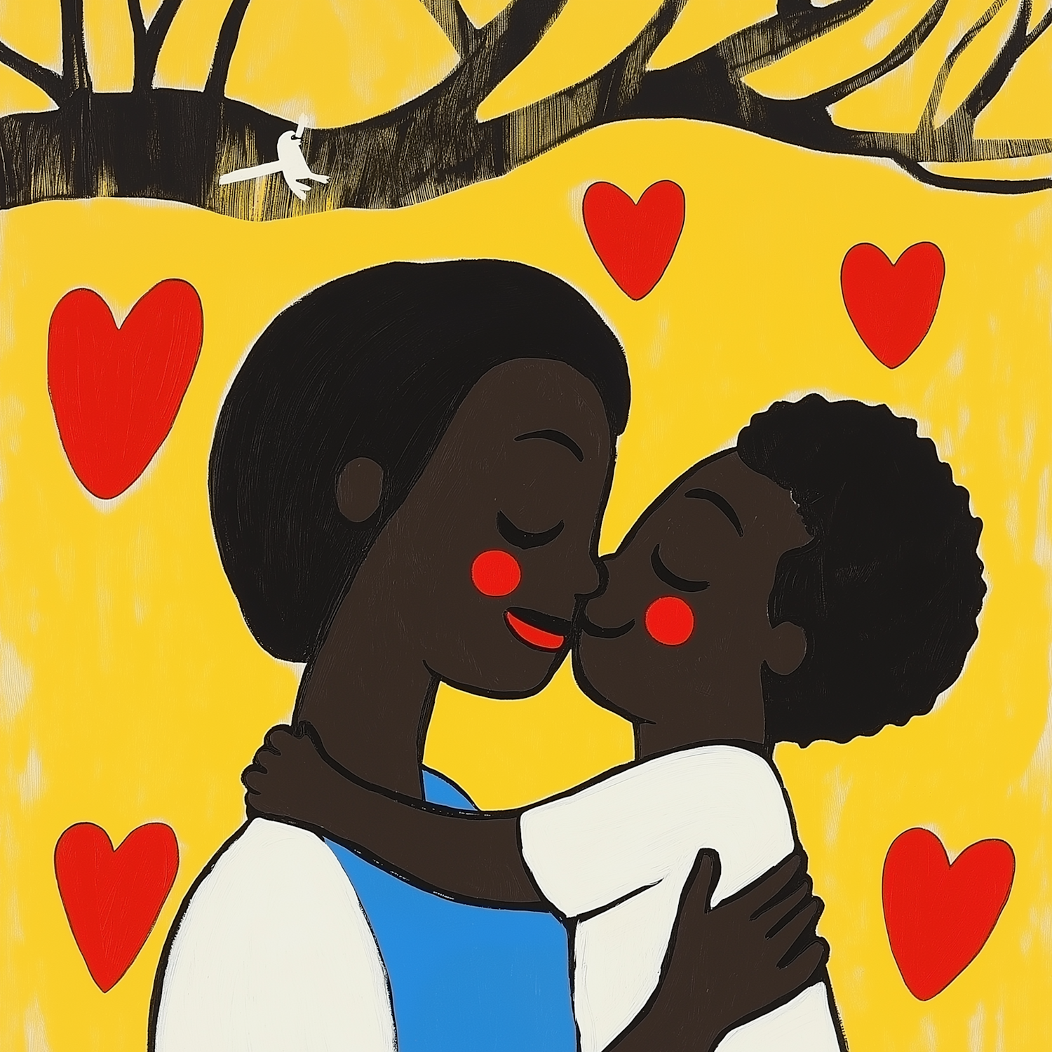 Heartwarming illustration of a mother and child embracing, set against a bright yellow background with red hearts.