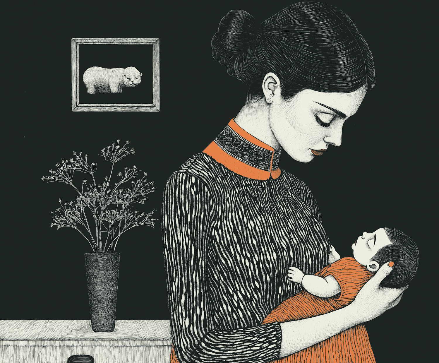 Illustration of a woman cradling a baby, with a vase and sheep picture in the background. Muted colors create a serene atmosphere.