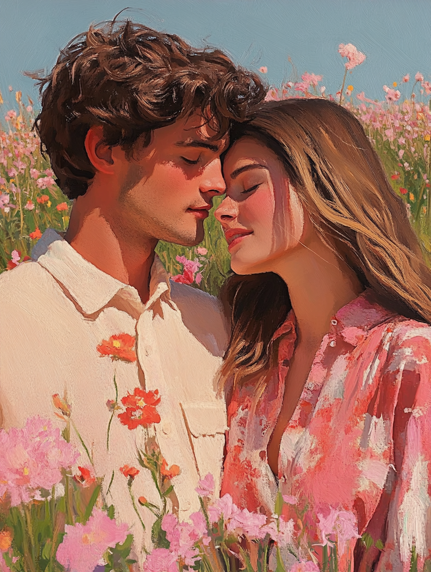 A romantic couple in a field of wildflowers, sharing an intimate moment under a clear blue sky.