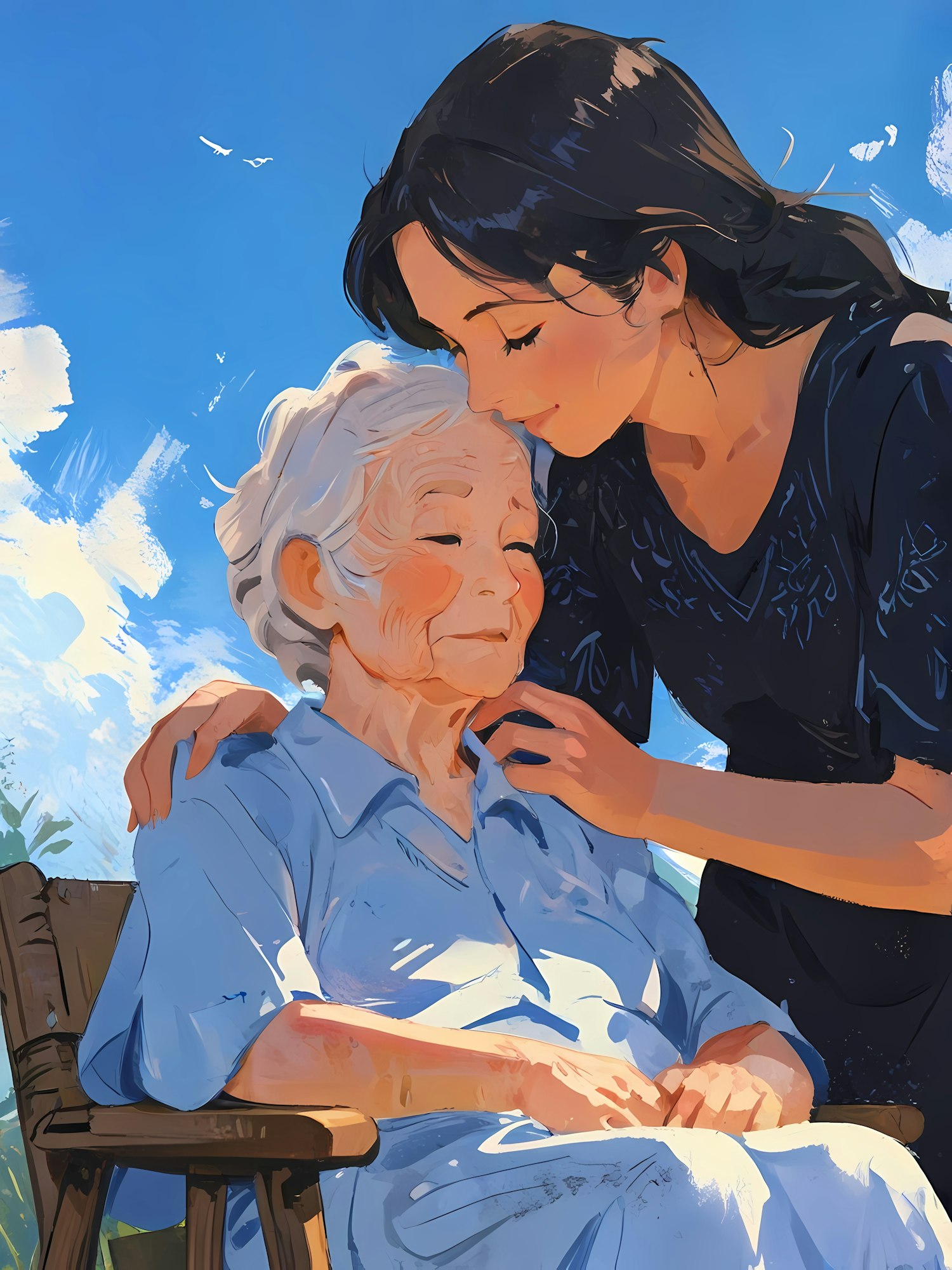 A young woman tenderly embraces an elderly woman outdoors under a bright, blue sky. A heartfelt and serene moment of familial connection.