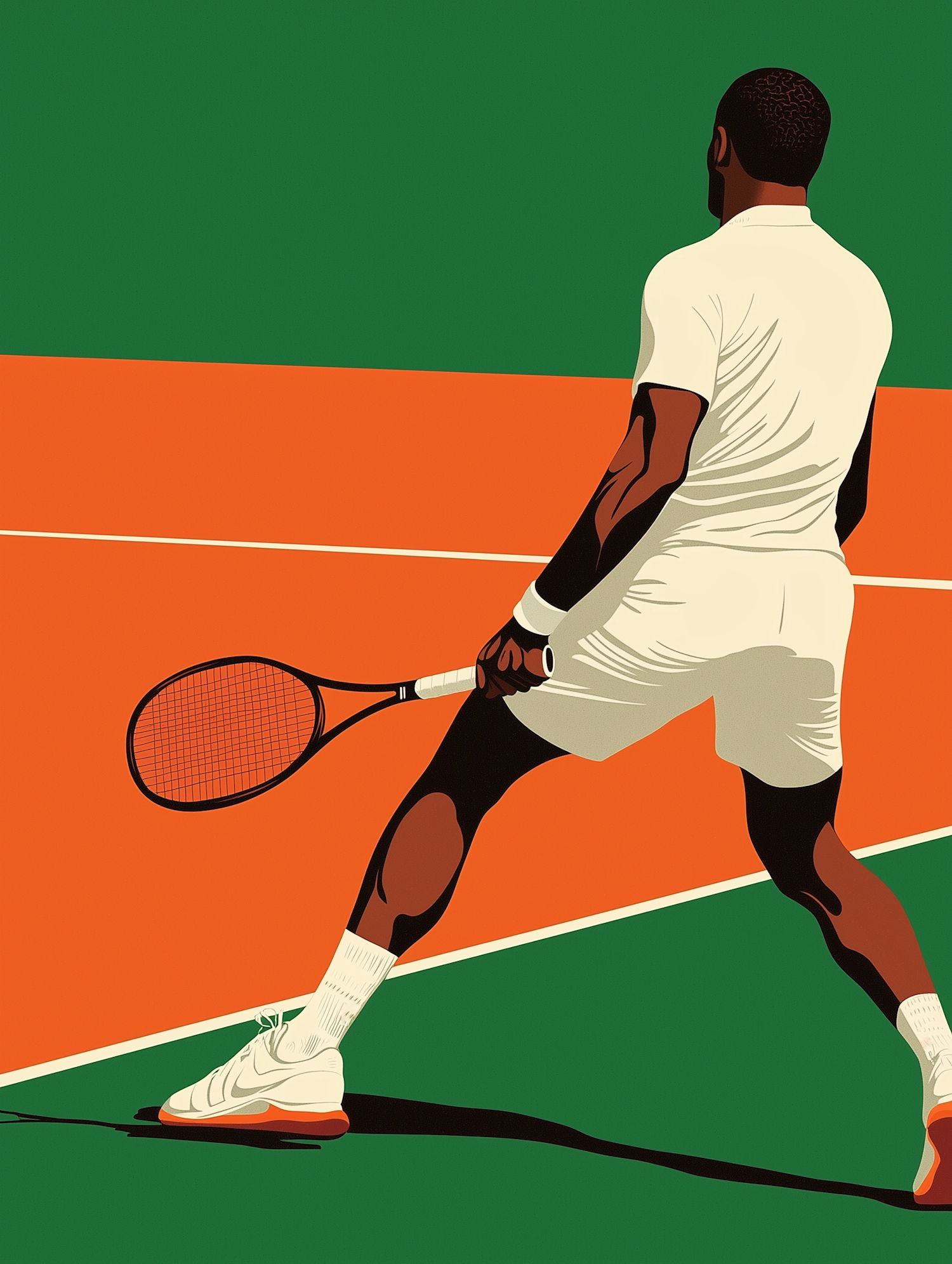 Stylized illustration of a tennis player in white attire on a vibrant orange and green court, holding a racket in a dynamic pose.
