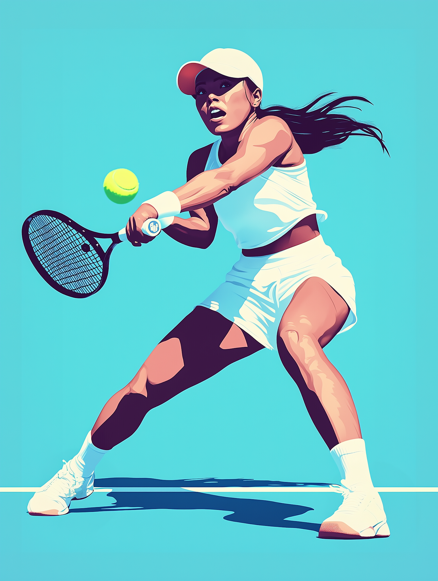 Dynamic illustration of a female tennis player in action, wearing white sportswear, against a bright blue background.