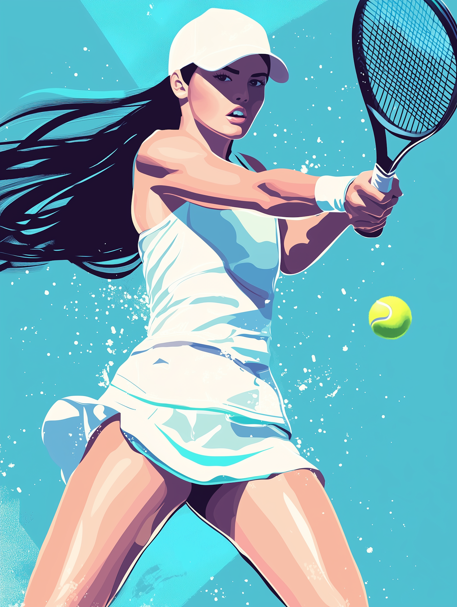 Dynamic illustration of a female tennis player mid-swing, with flowing hair, a white outfit, and a bright blue background.