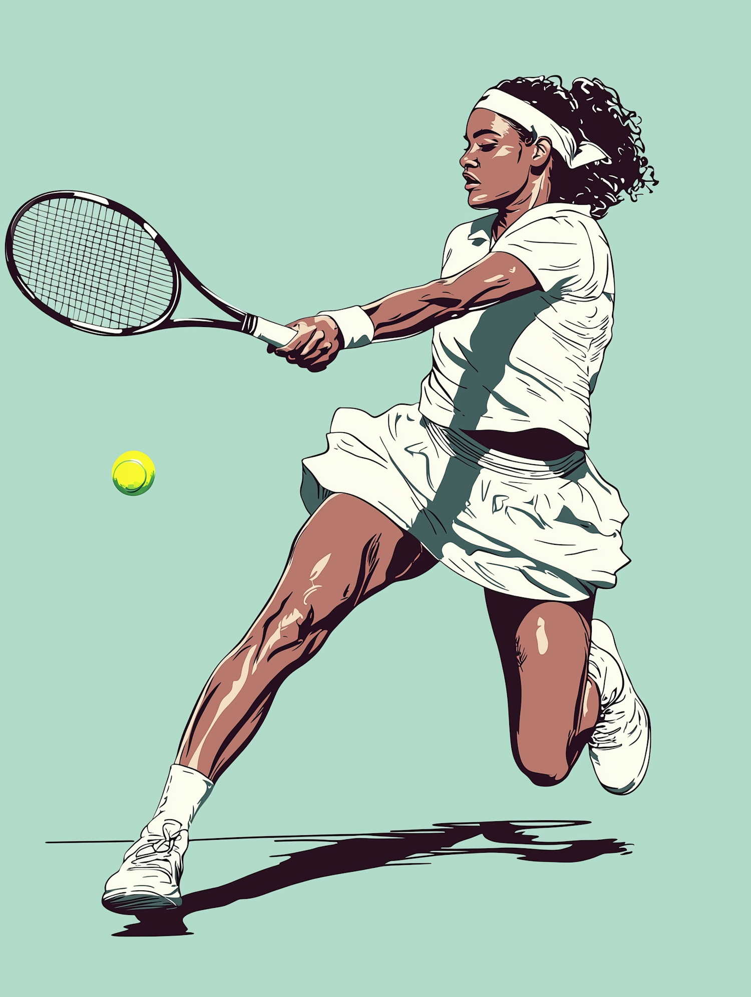 Illustration of a female tennis player hitting a forehand shot, wearing a white outfit, with a teal background and a yellow tennis ball.