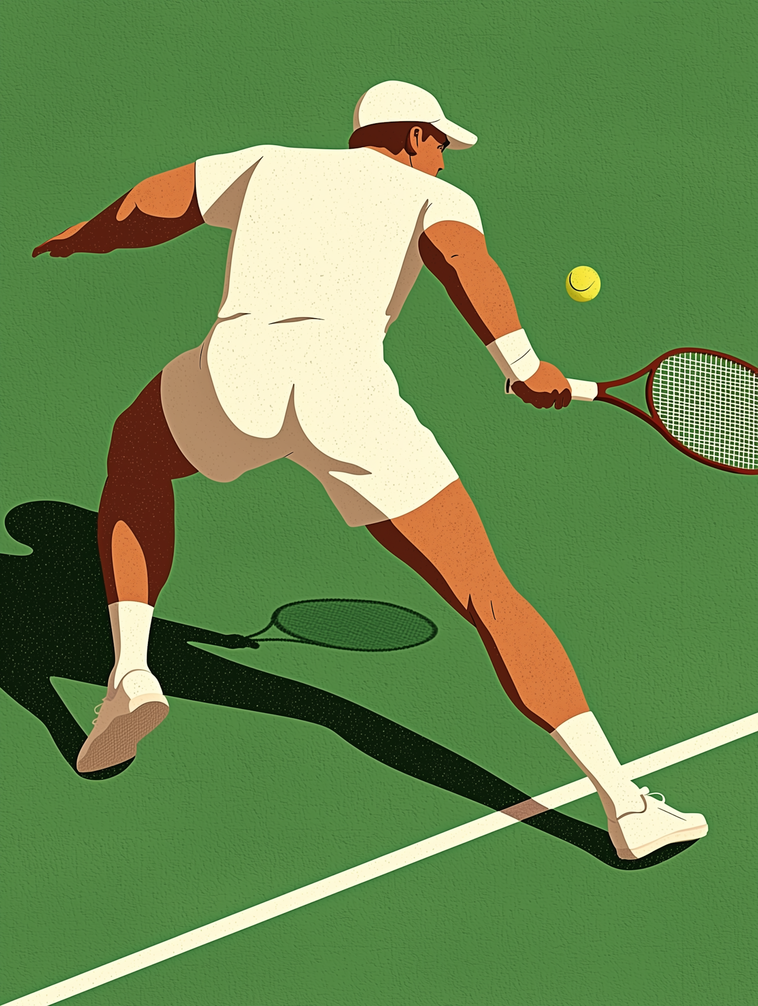 Stylized illustration of a tennis player mid-swing on a green court, wearing white attire and preparing to hit a yellow ball.