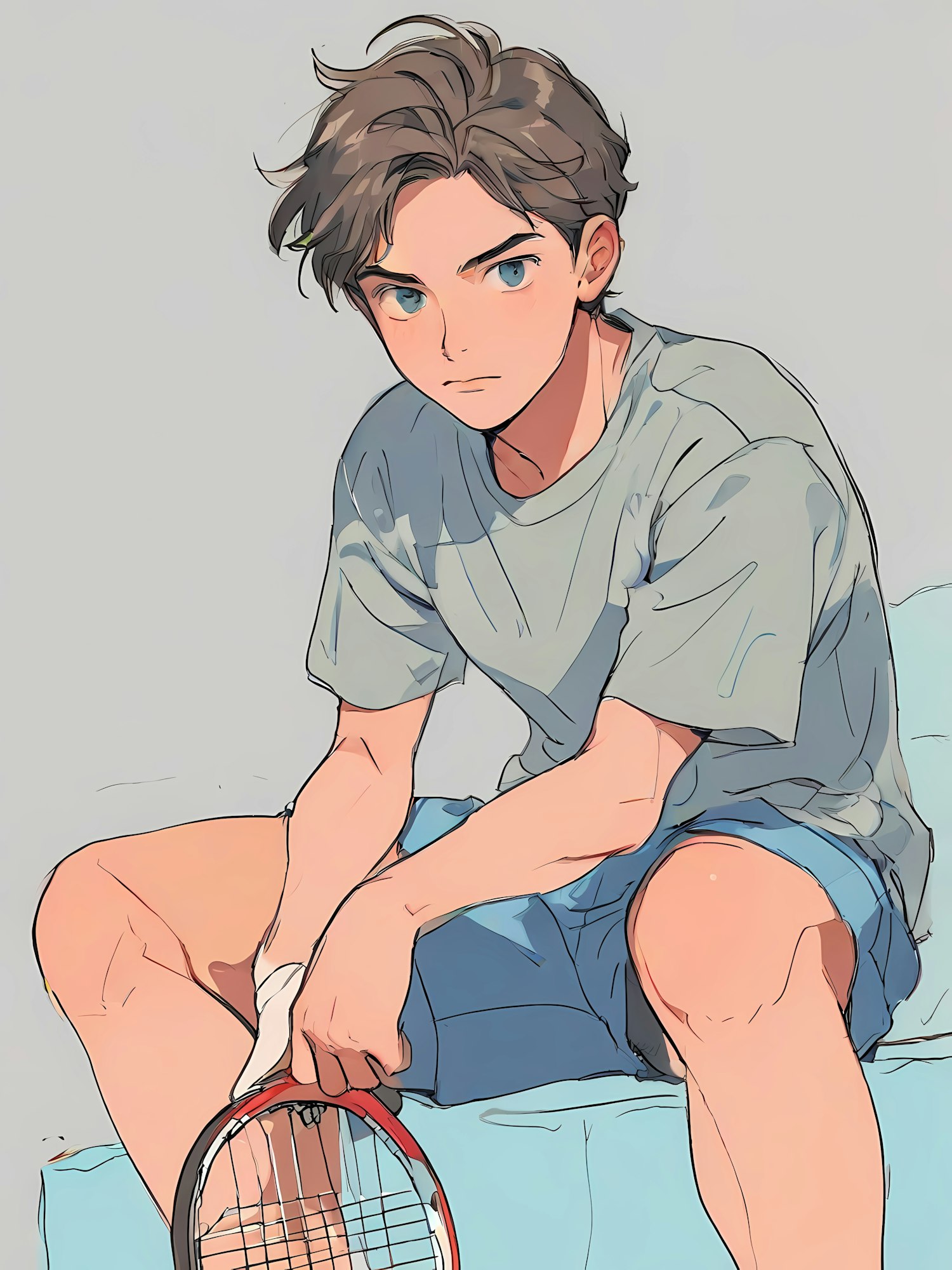 Stylized illustration of a young man with blue eyes holding a tennis racket, wearing a gray t-shirt and blue shorts, sitting on a bench.