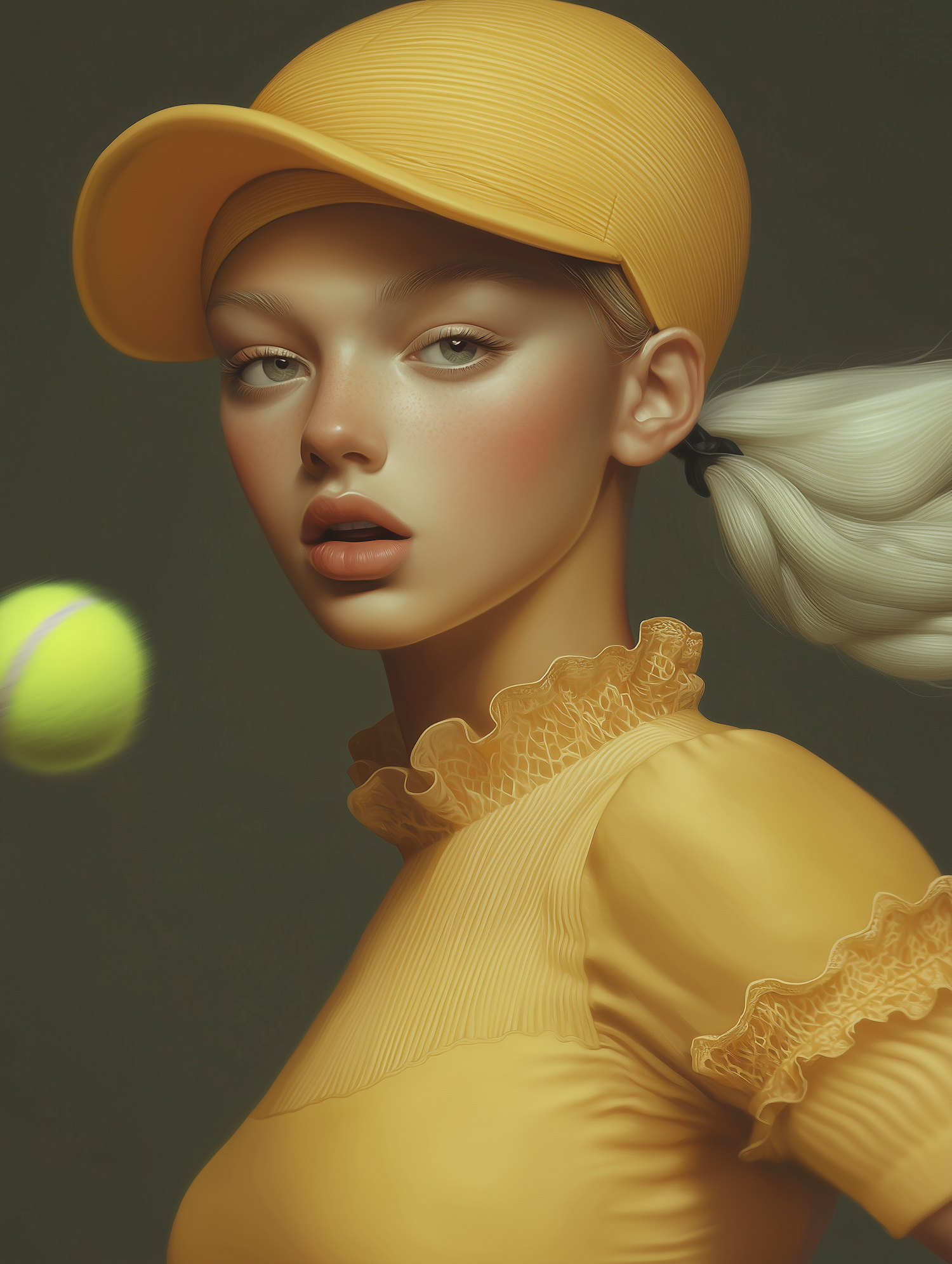 Stylized illustration of a blonde woman in a yellow cap and lace top, with a tennis ball mid-air against a muted green background.