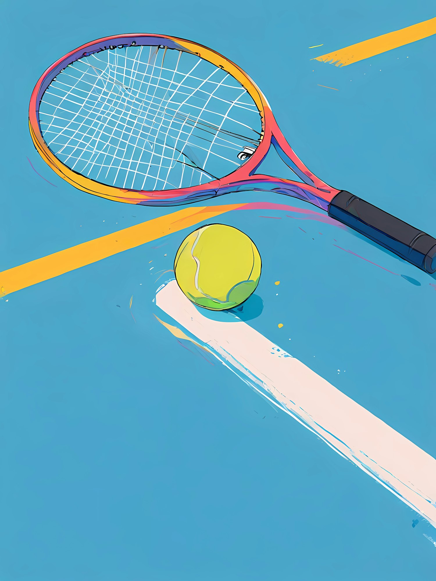 Colorful illustration of a tennis racket and ball on a blue court with vibrant lines.