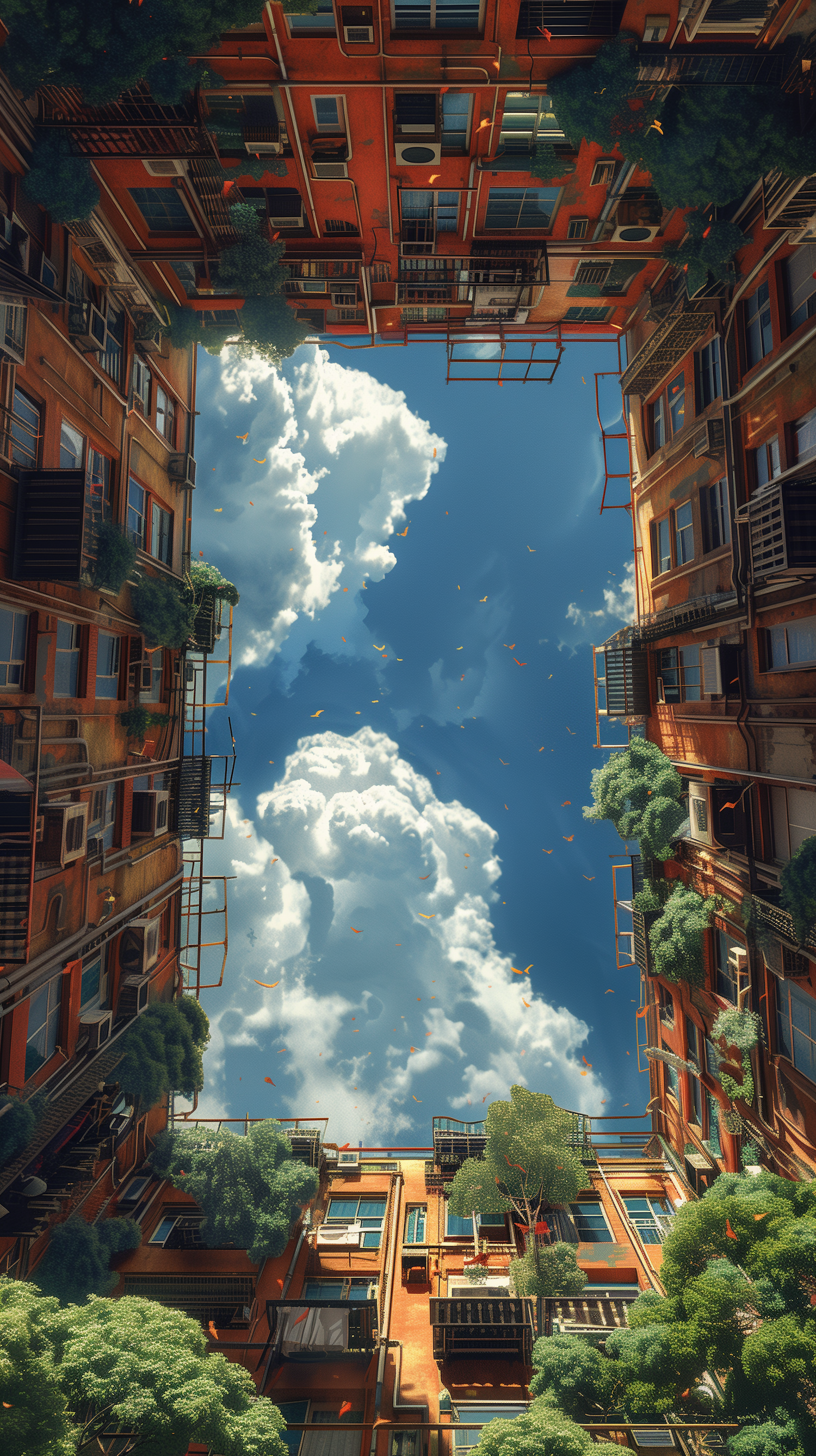 Upward view of orange apartment buildings with lush greenery, golden leaves, and a vibrant blue sky with fluffy clouds.