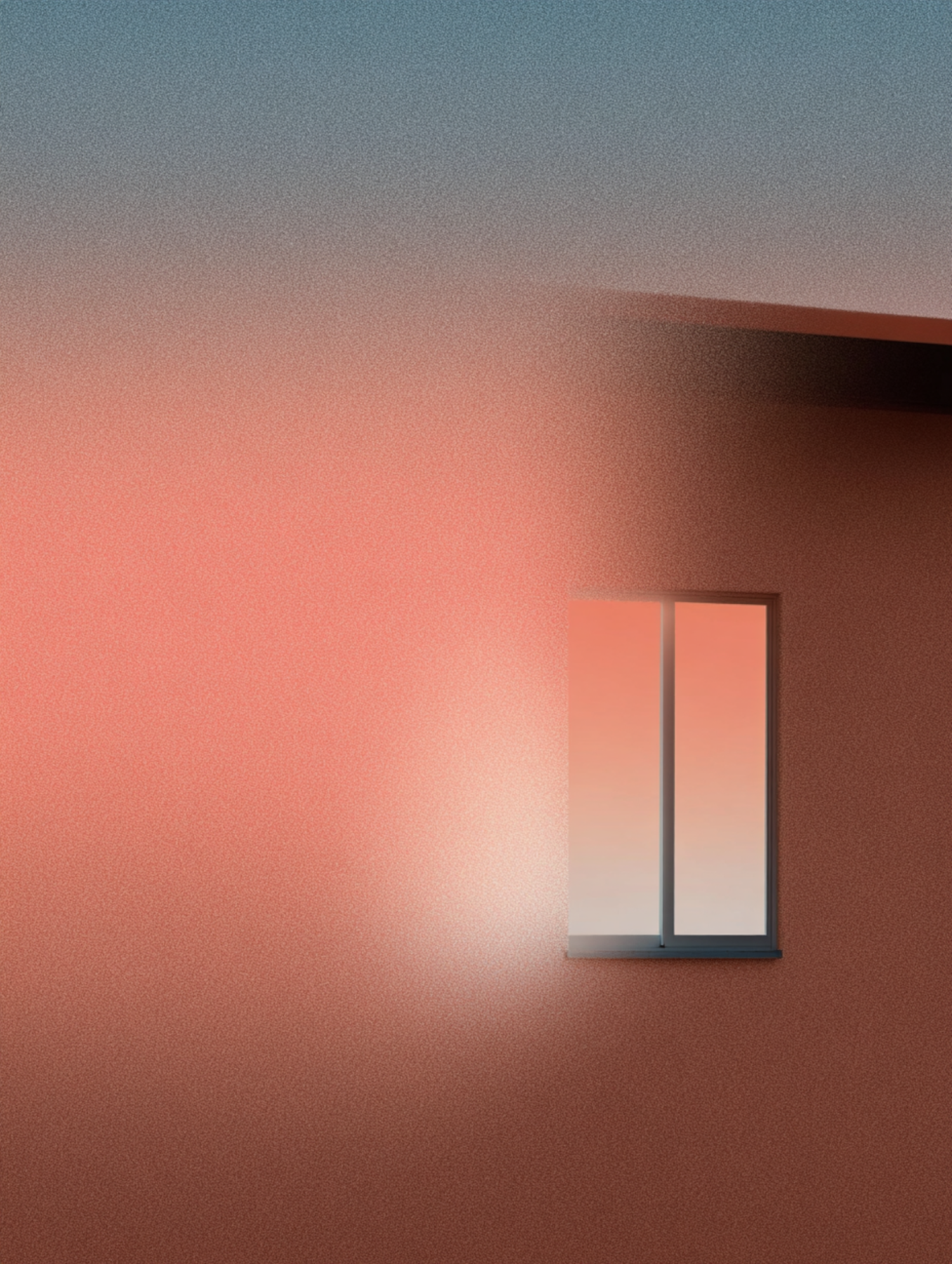 Minimalist architecture with a terracotta wall and a modern window, set against a gradient sky transitioning from orange to blue.