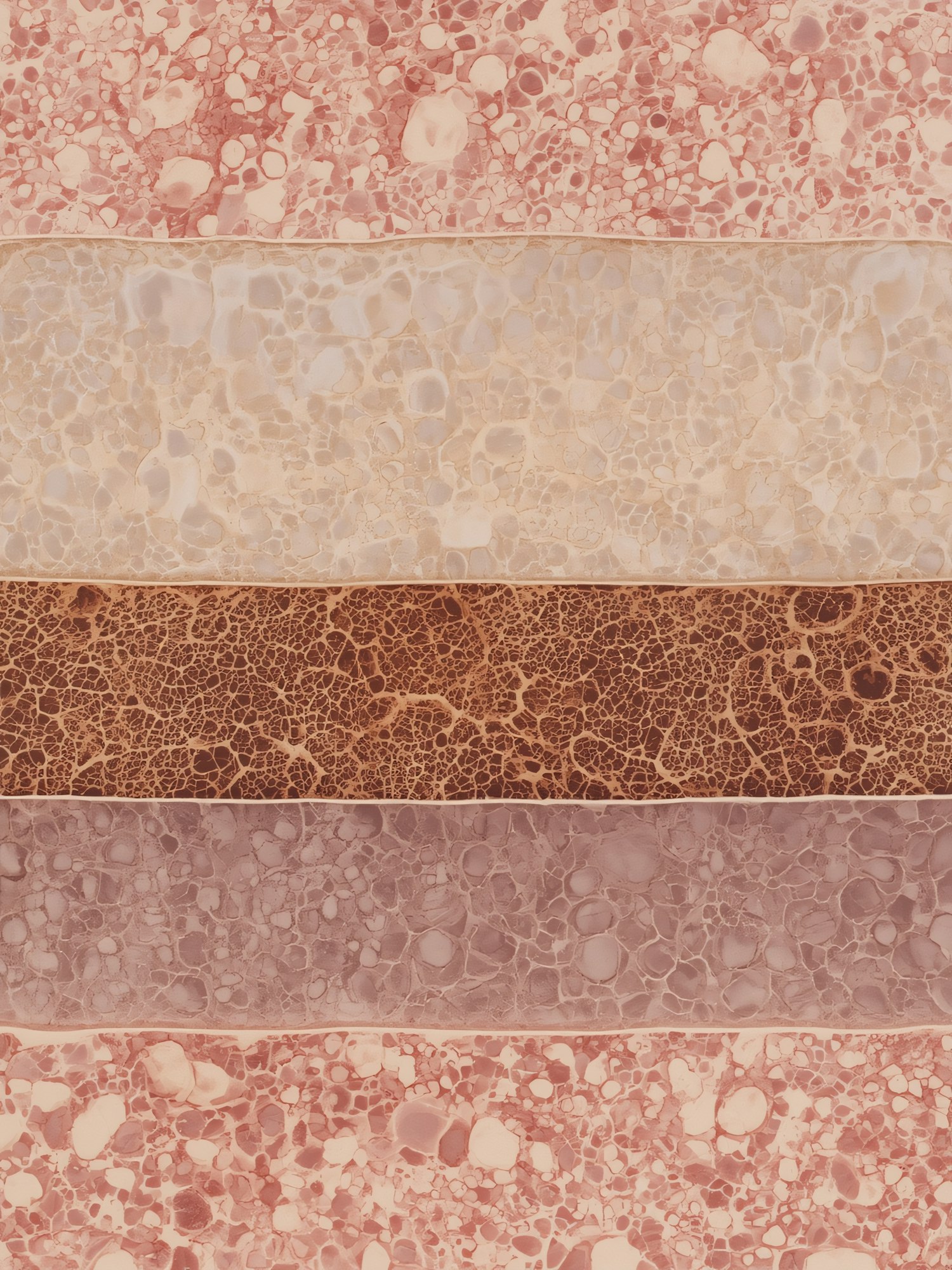 A textured abstract artwork with horizontal bands of pink, beige, brown, and purple, each featuring unique marbled and cracked patterns.