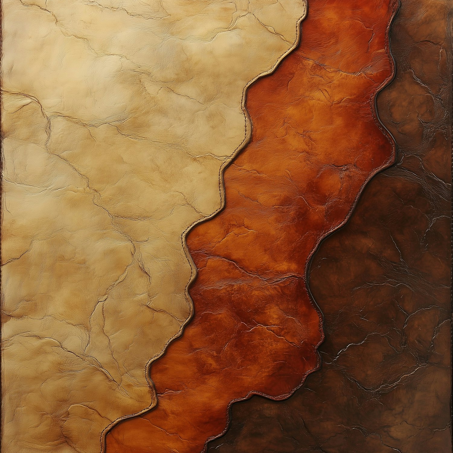 Abstract textured leather design with beige, orange-brown, and chocolate tones, divided by wavy lines for a natural, earthy aesthetic.