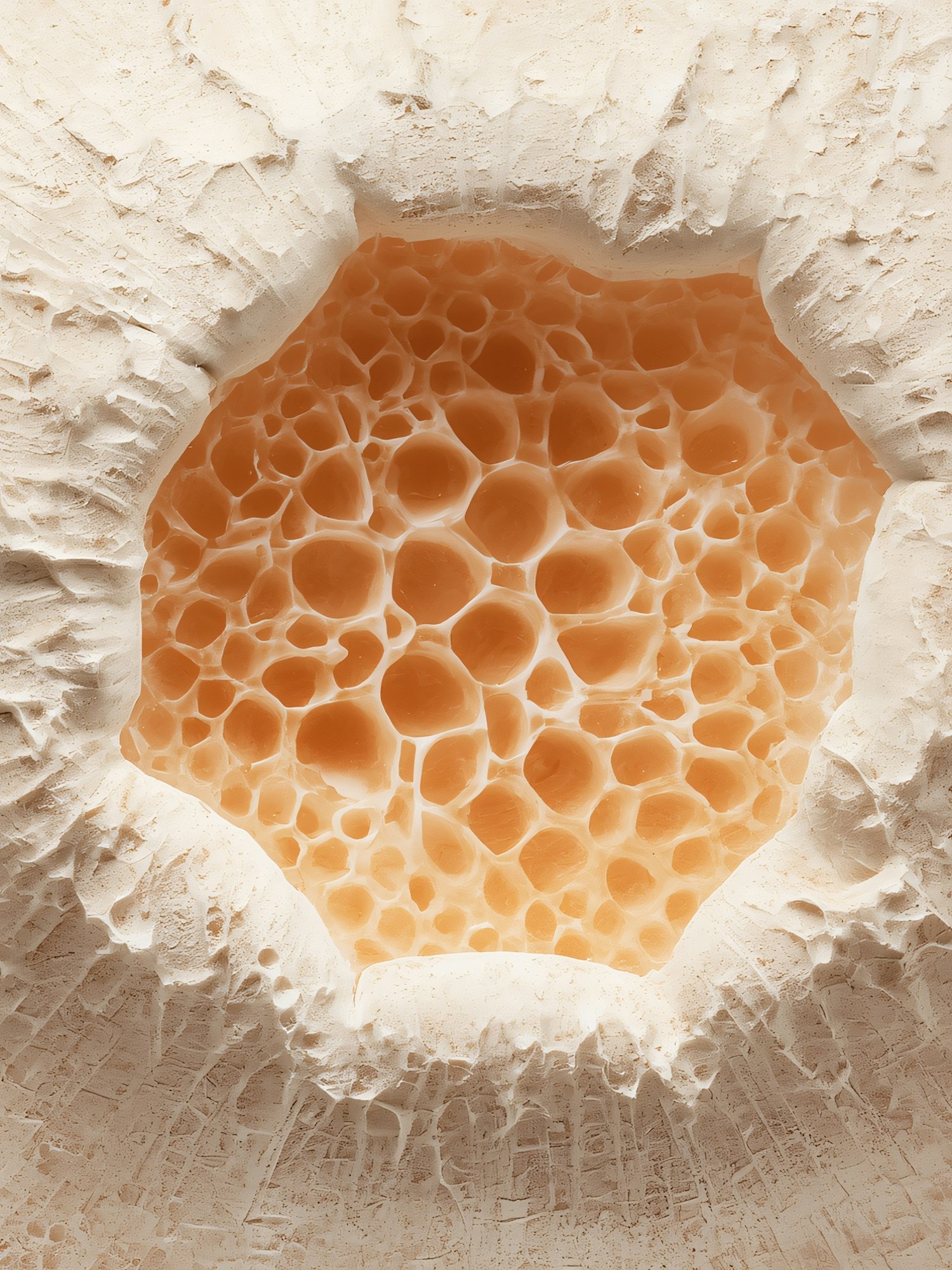 Close-up of a porous material with a beige outer layer and orange honeycomb-like interior, showcasing intricate textures and depth.