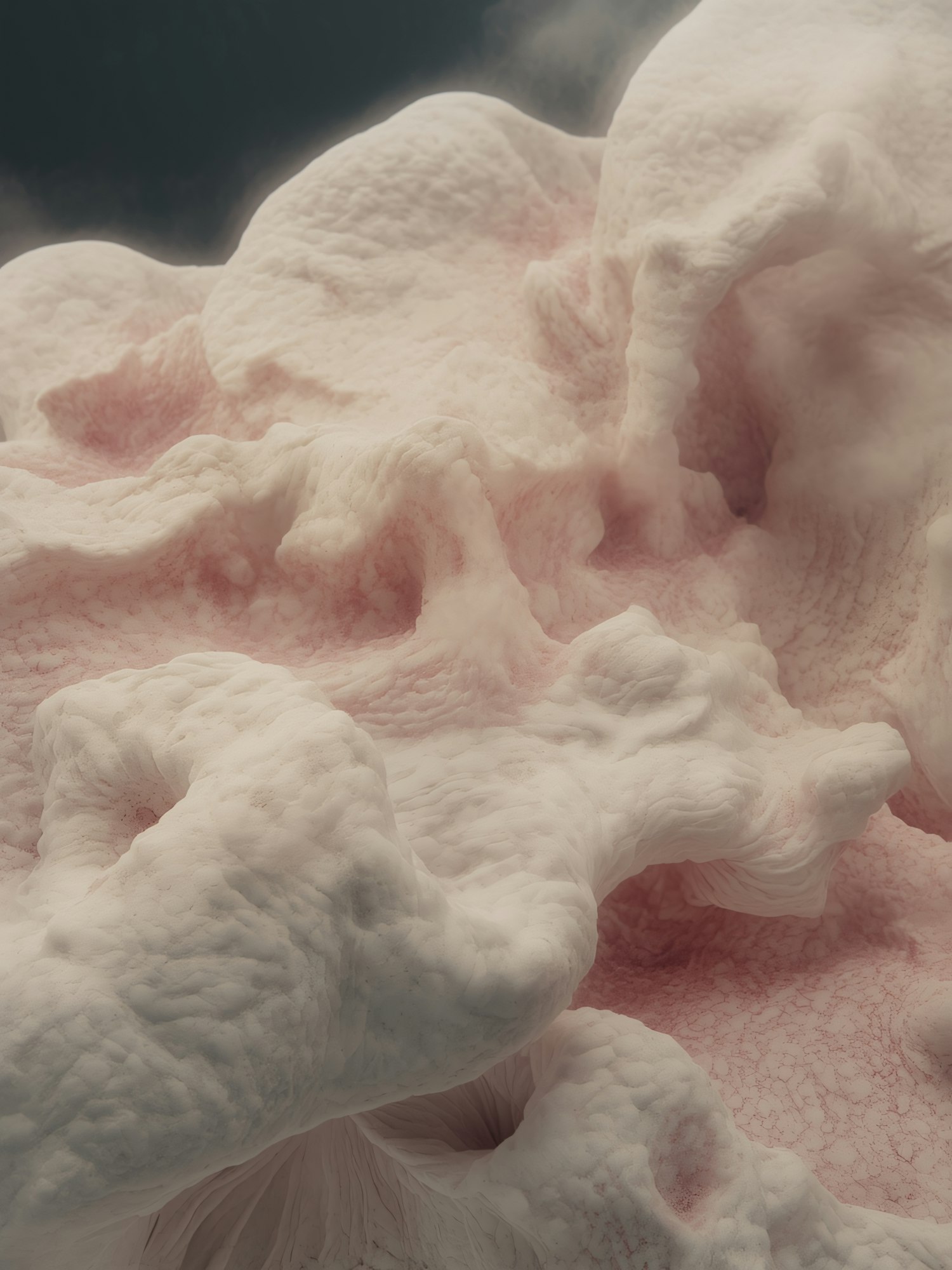 Close-up of a textured, organic surface with creamy white and pink tones, showcasing intricate details and a soft, undulating structure.