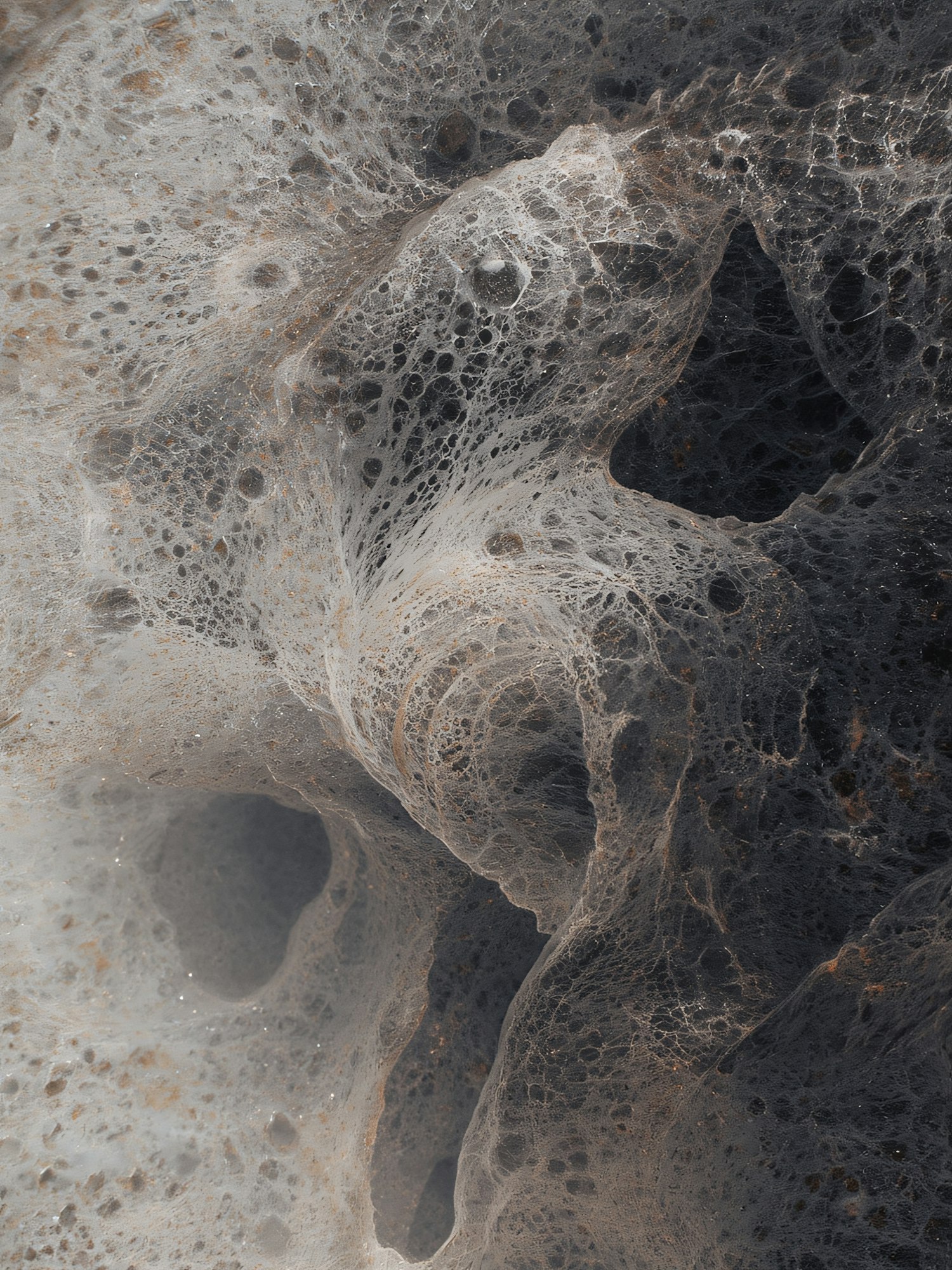 Close-up of a textured, web-like surface with intricate patterns and earthy tones, creating a mysterious and organic appearance.