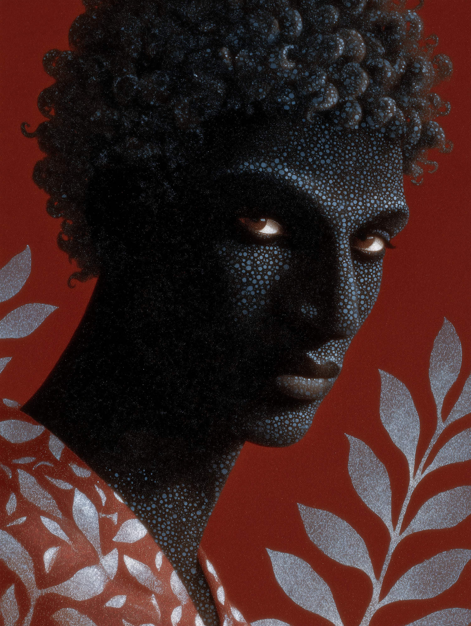 Artistic portrait of a person with textured skin and curly hair, set against a red background with bold leaf-patterned clothing.