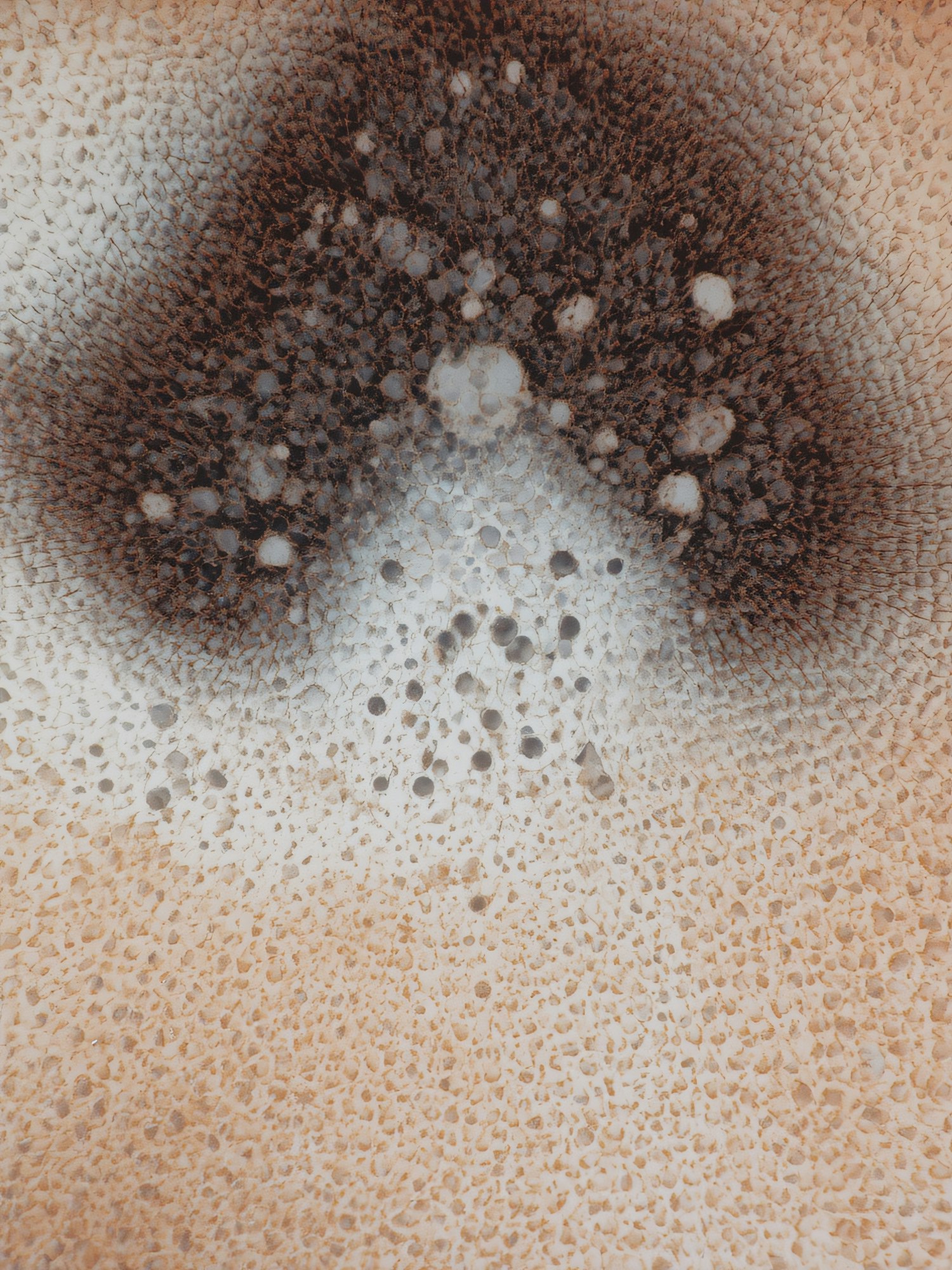 Close-up of a textured surface with a gradient of beige to dark brown, featuring porous patterns and organic details.