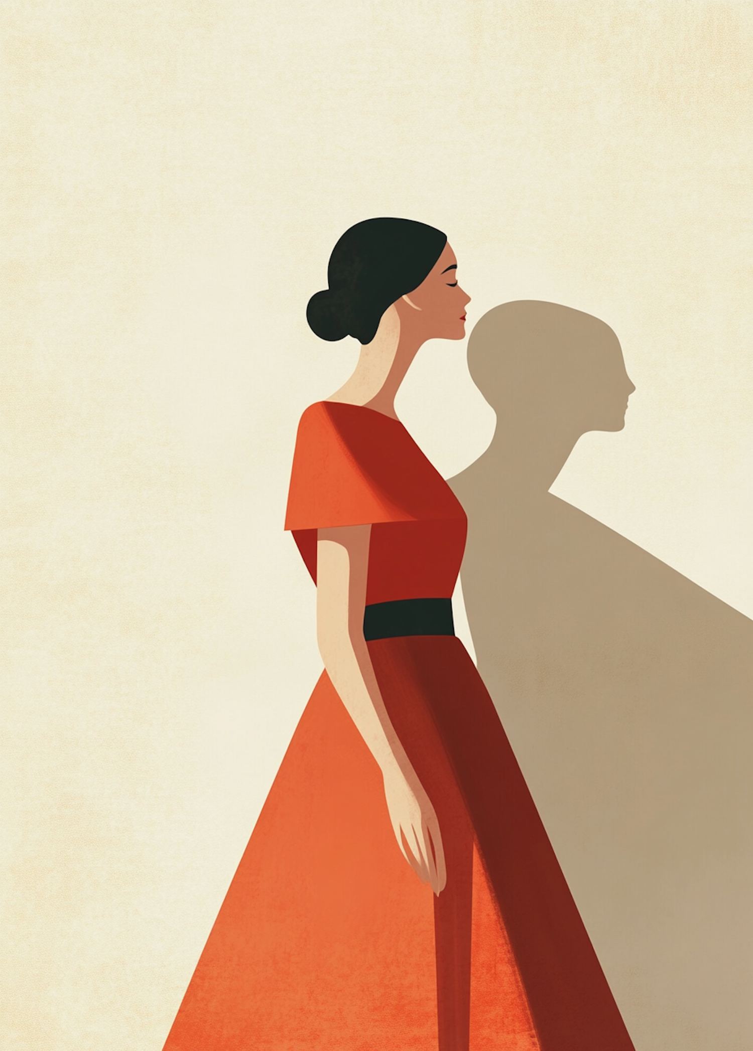 Minimalist illustration of a woman in a red dress with a serene expression, casting a shadow on a beige background.