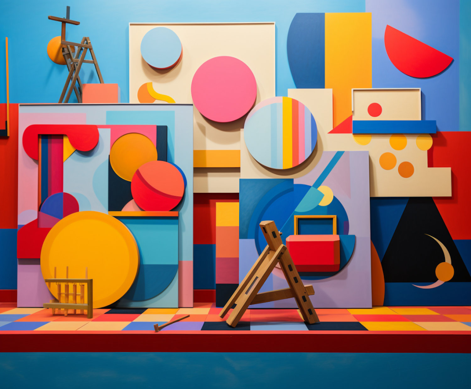 Colorful abstract art installation with geometric shapes, bold colors, and wooden elements creating a dynamic visual experience.