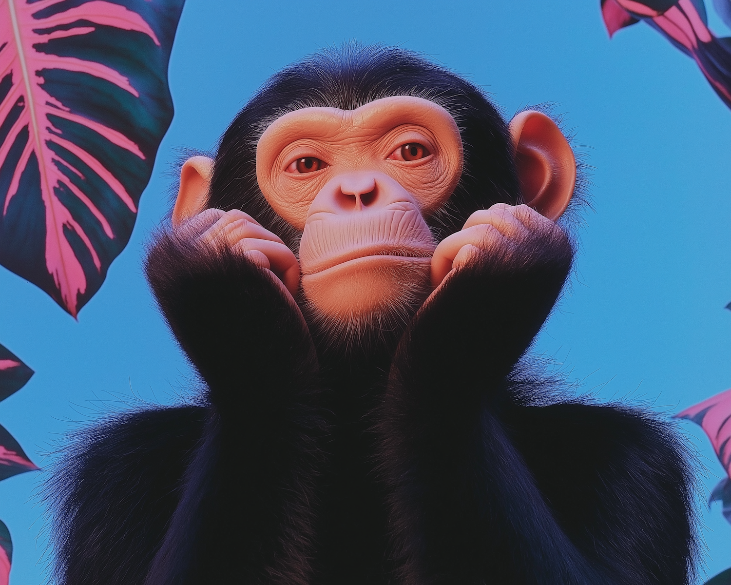 A thoughtful chimpanzee rests its chin on its hands, surrounded by vibrant tropical leaves and a bright blue background.
