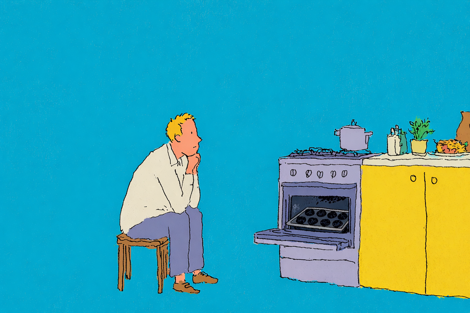 A colorful illustration of a person sitting by an oven, surrounded by kitchen items, set against a vibrant blue background.