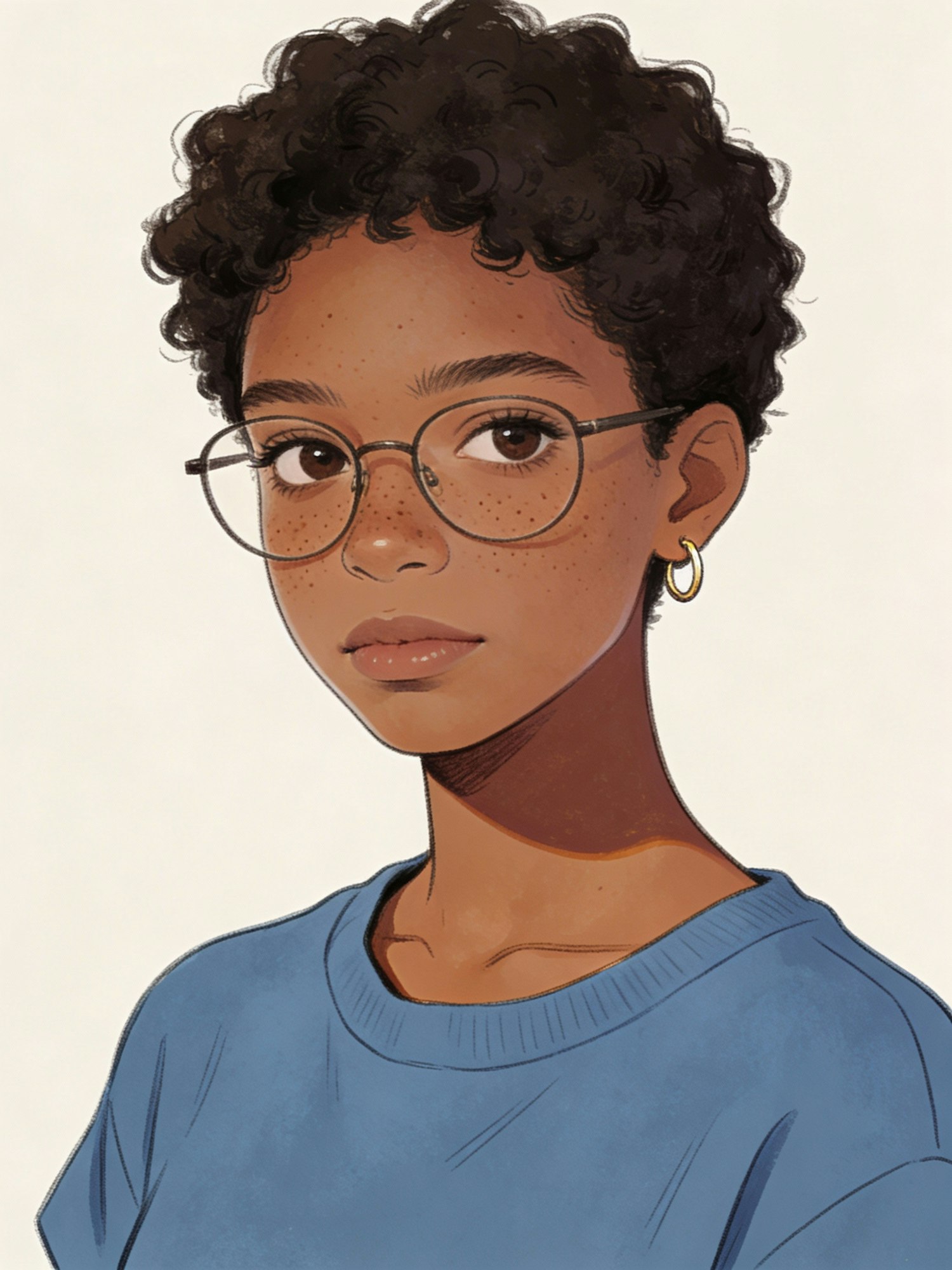 A detailed digital illustration of a young person with curly hair, glasses, and a blue shirt, set against a plain background.