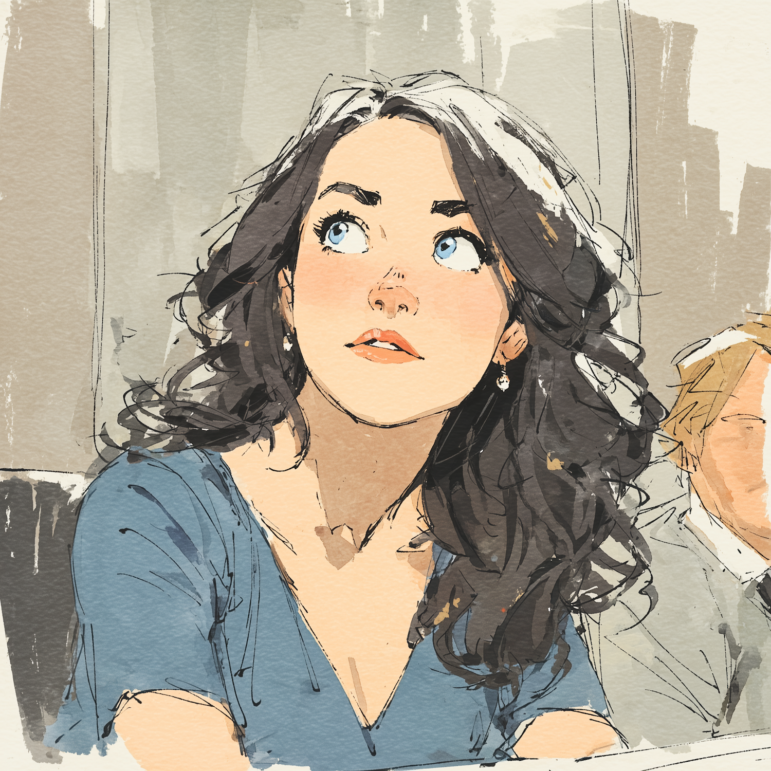 Stylized illustration of a thoughtful woman with wavy dark hair and blue eyes, set against a muted background with artistic textures.