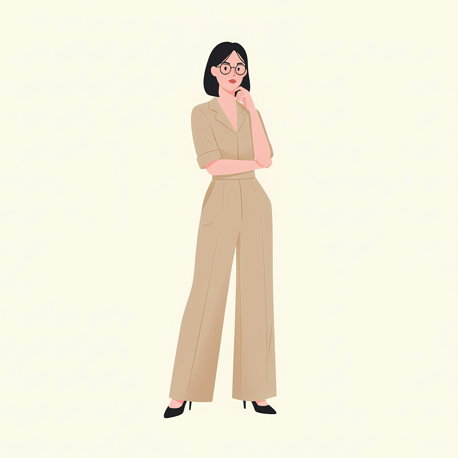 Stylish illustration of a woman in a beige jumpsuit and glasses, standing thoughtfully against a light background.