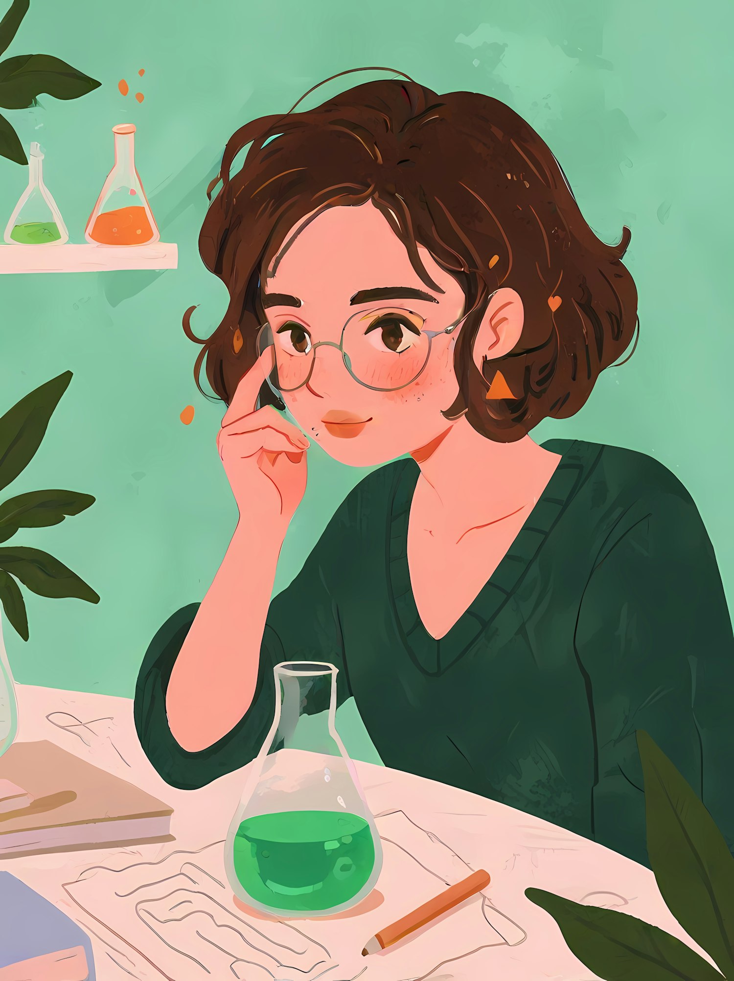 Illustration of a young woman in glasses, pondering over a flask with green liquid, set against a soft green background.