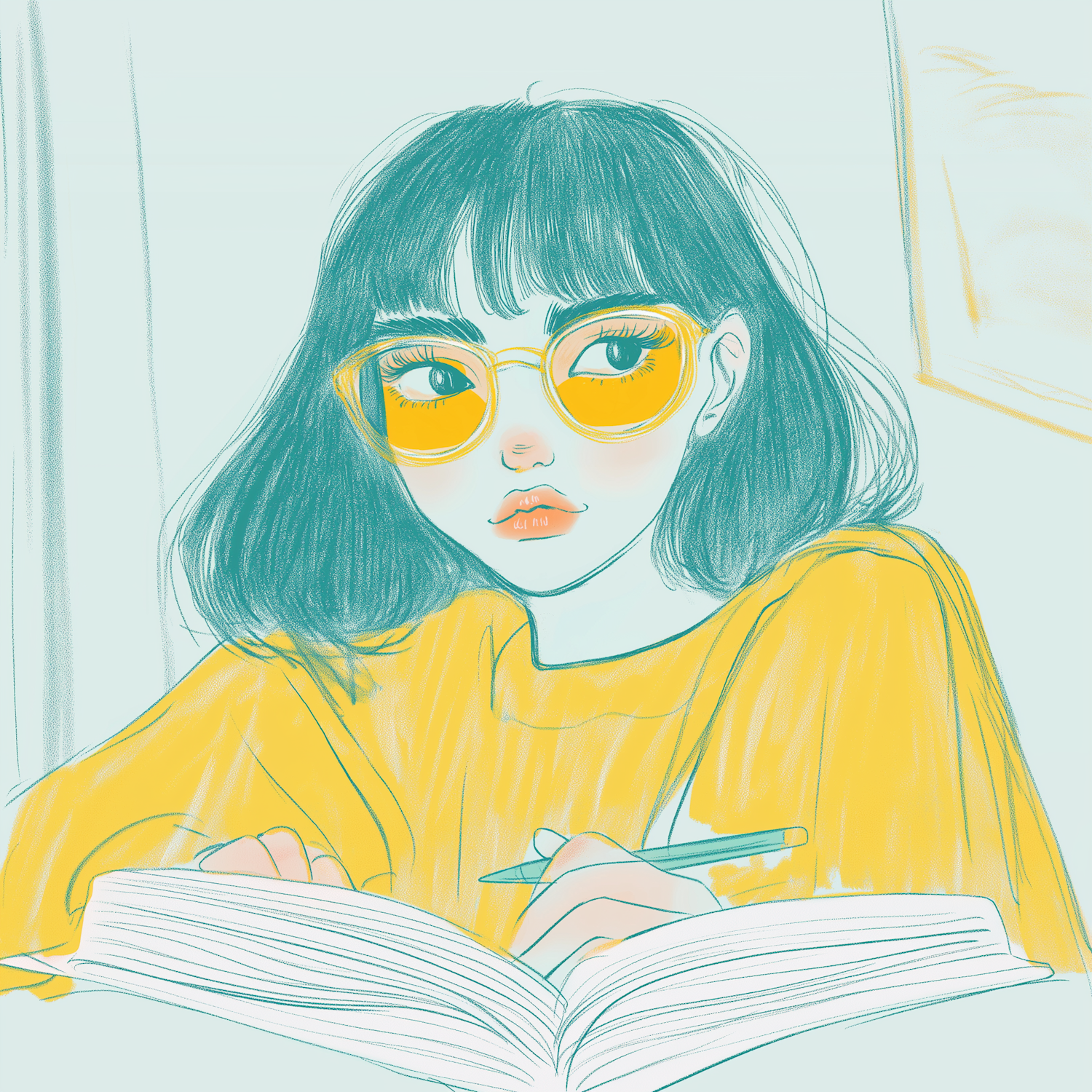 Stylized illustration of a young woman with yellow glasses and sweater, holding a pencil over an open book. Modern and vibrant art style.