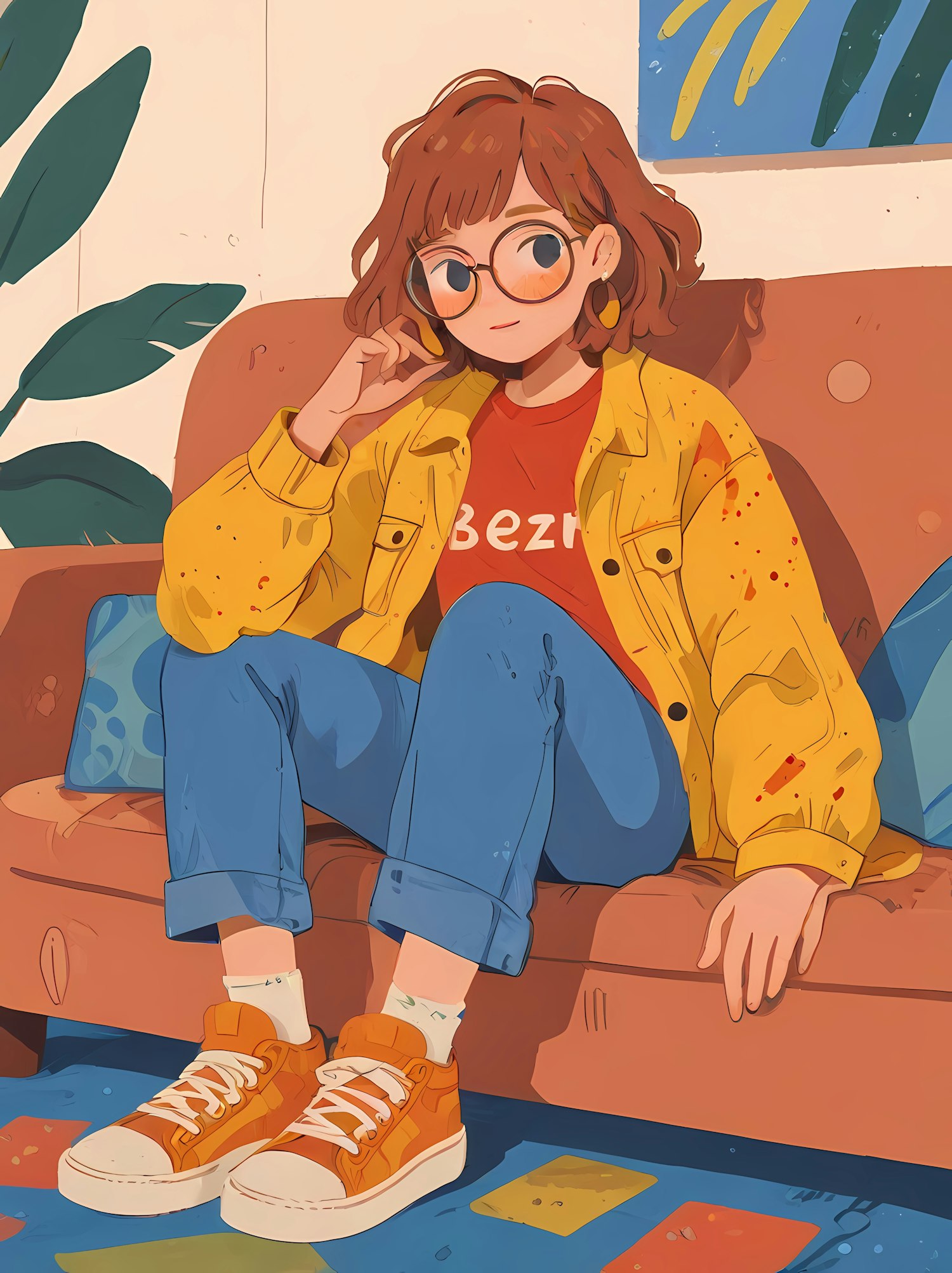 Stylish young woman in a yellow jacket and orange sneakers relaxes on a couch, surrounded by vibrant decor and a cozy atmosphere.