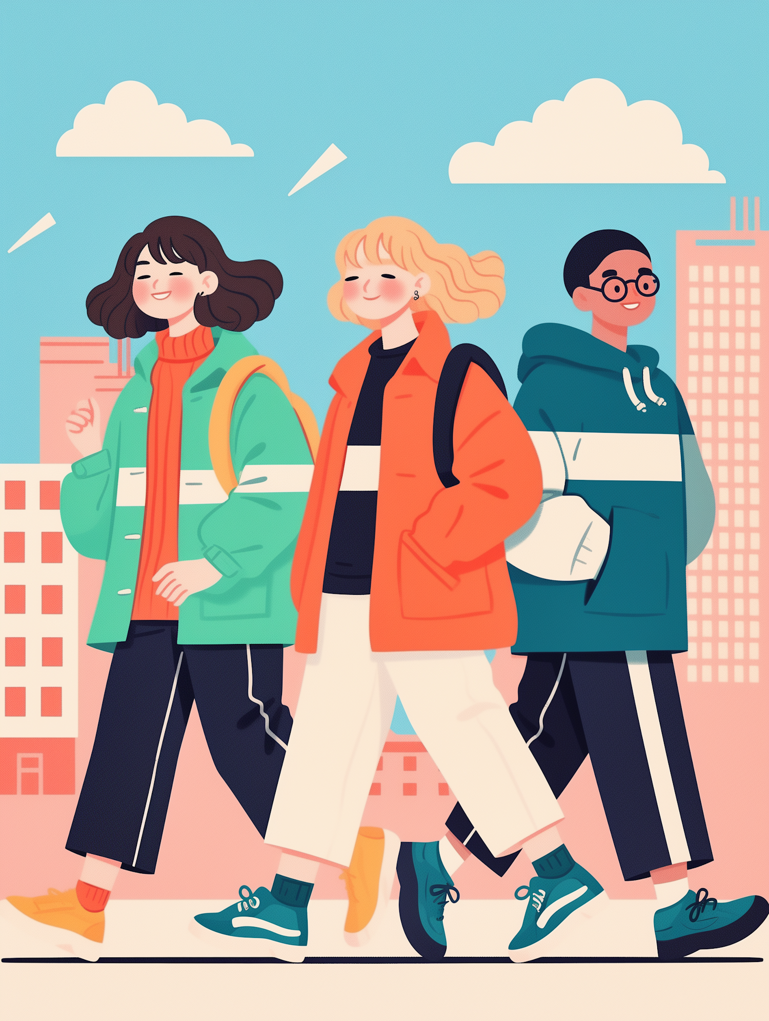 Three cartoon characters walk in a colorful cityscape, wearing vibrant jackets and carrying backpacks, under a bright blue sky.