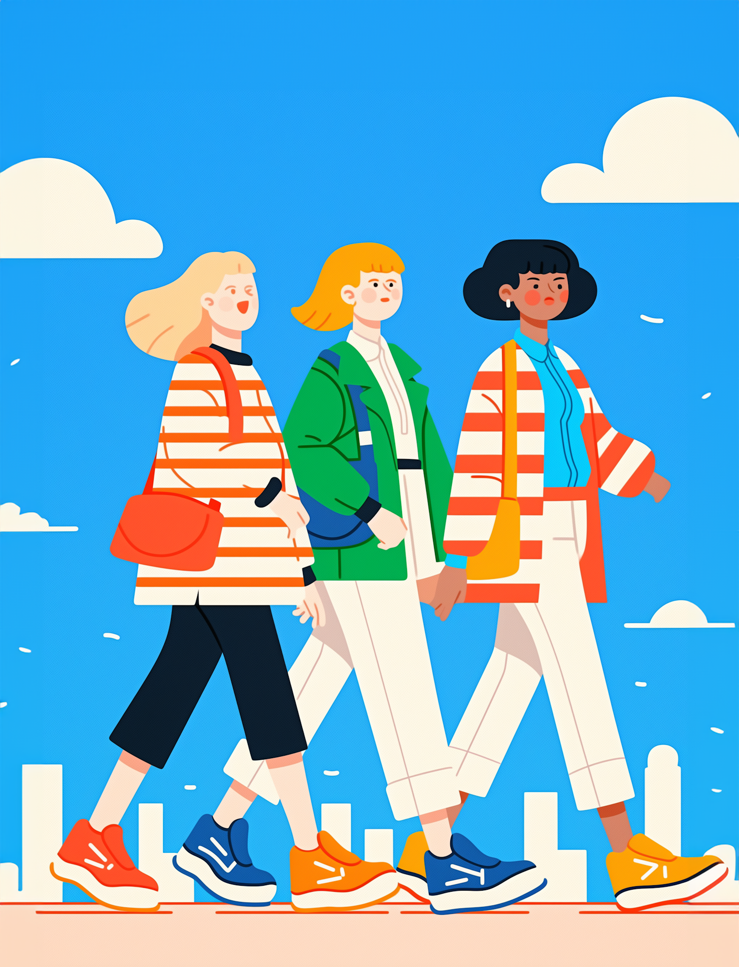 Three stylish women walking in a vibrant cityscape, wearing colorful outfits and sneakers, under a bright blue sky with clouds.