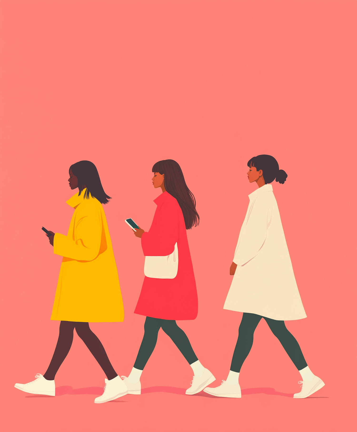 Three women in colorful coats walk side by side, each holding a phone, against a pink background. Modern and stylish illustration.