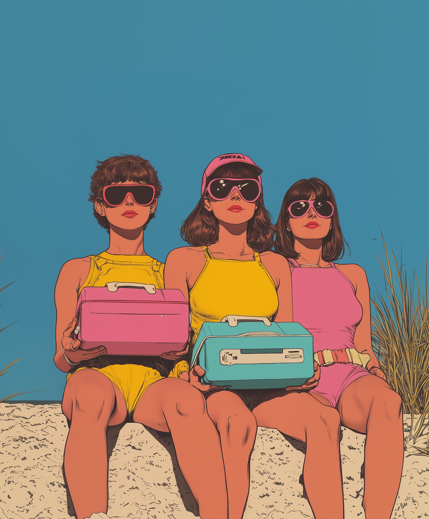 Three women in colorful swimsuits and sunglasses hold lunchboxes on a sunny beach, exuding a retro summer vibe.