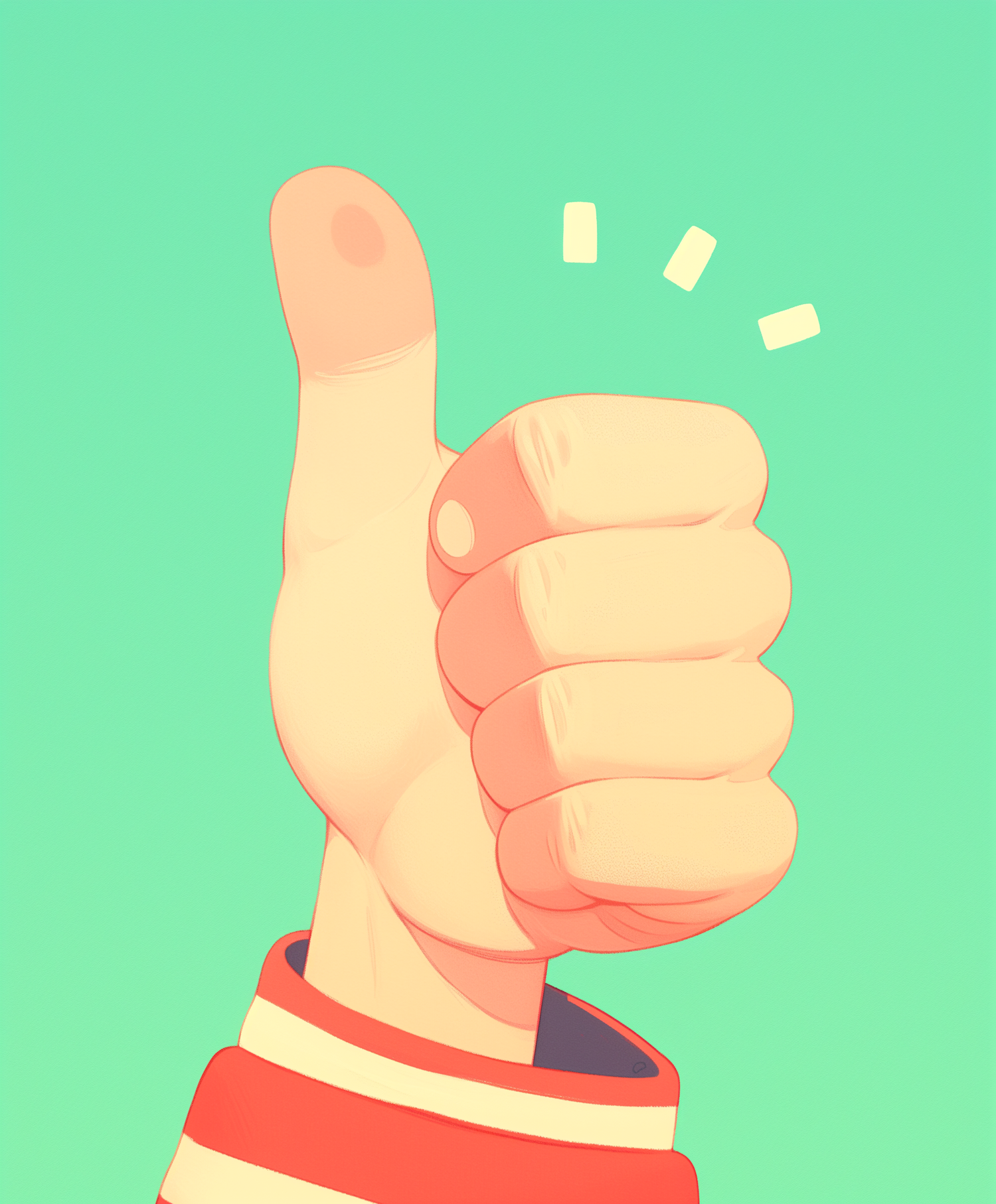 Cartoon hand giving a thumbs-up with a red and white sleeve on a teal background, conveying positivity and approval.
