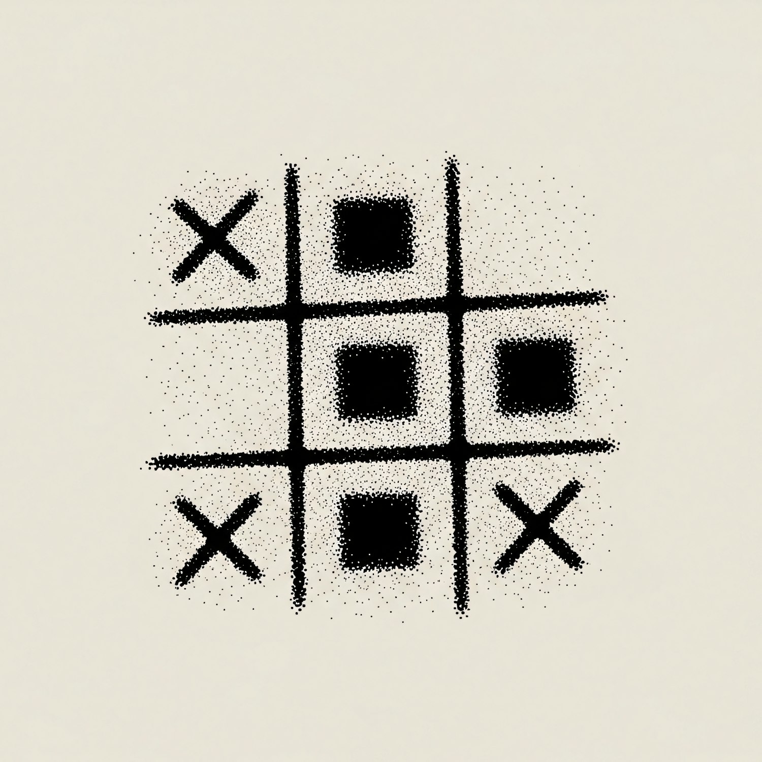 Minimalist tic-tac-toe grid with Xs and filled squares, featuring a stippled texture on a light beige background.