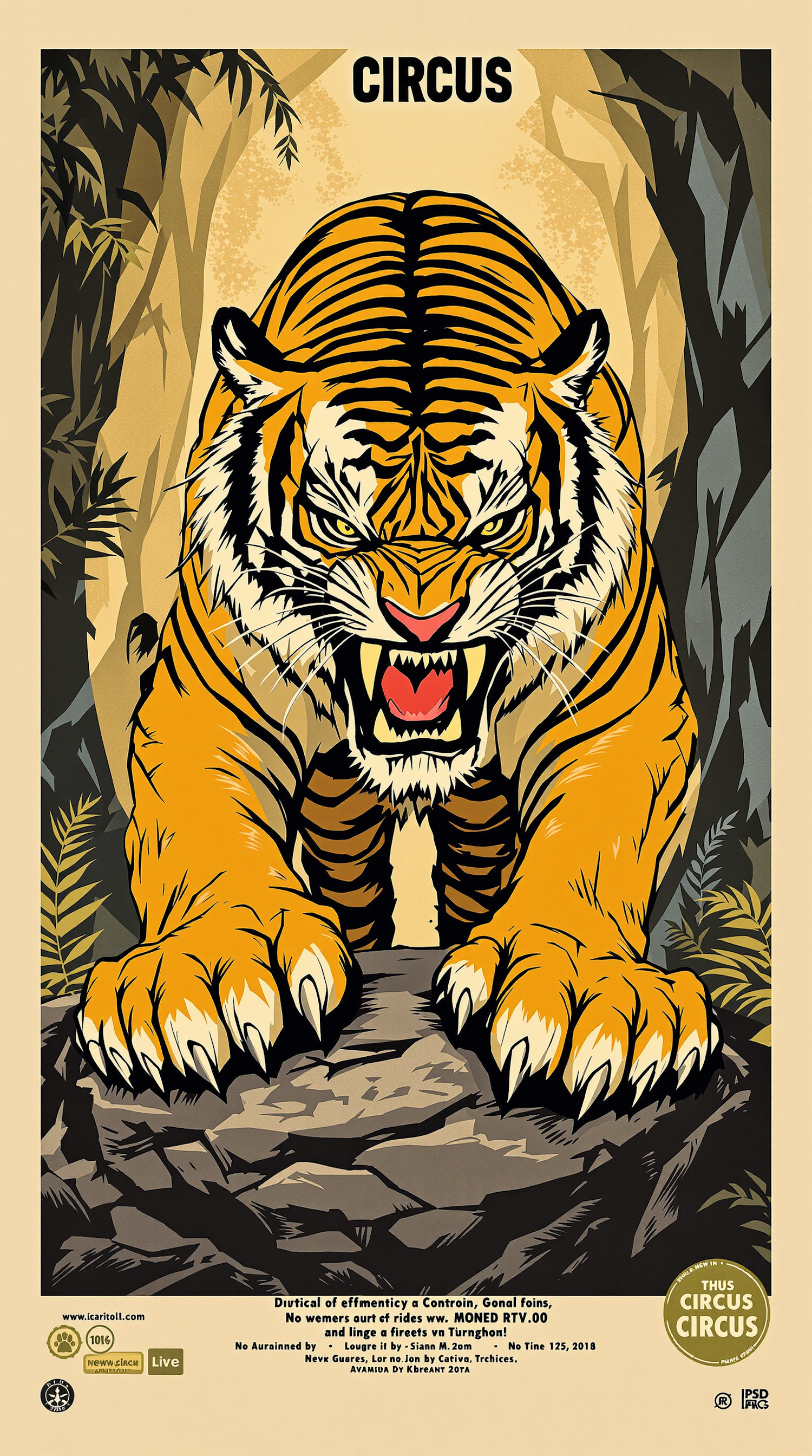 A vibrant illustration of a roaring tiger in a jungle setting, designed as a vintage-style circus poster with bold colors and dramatic details.