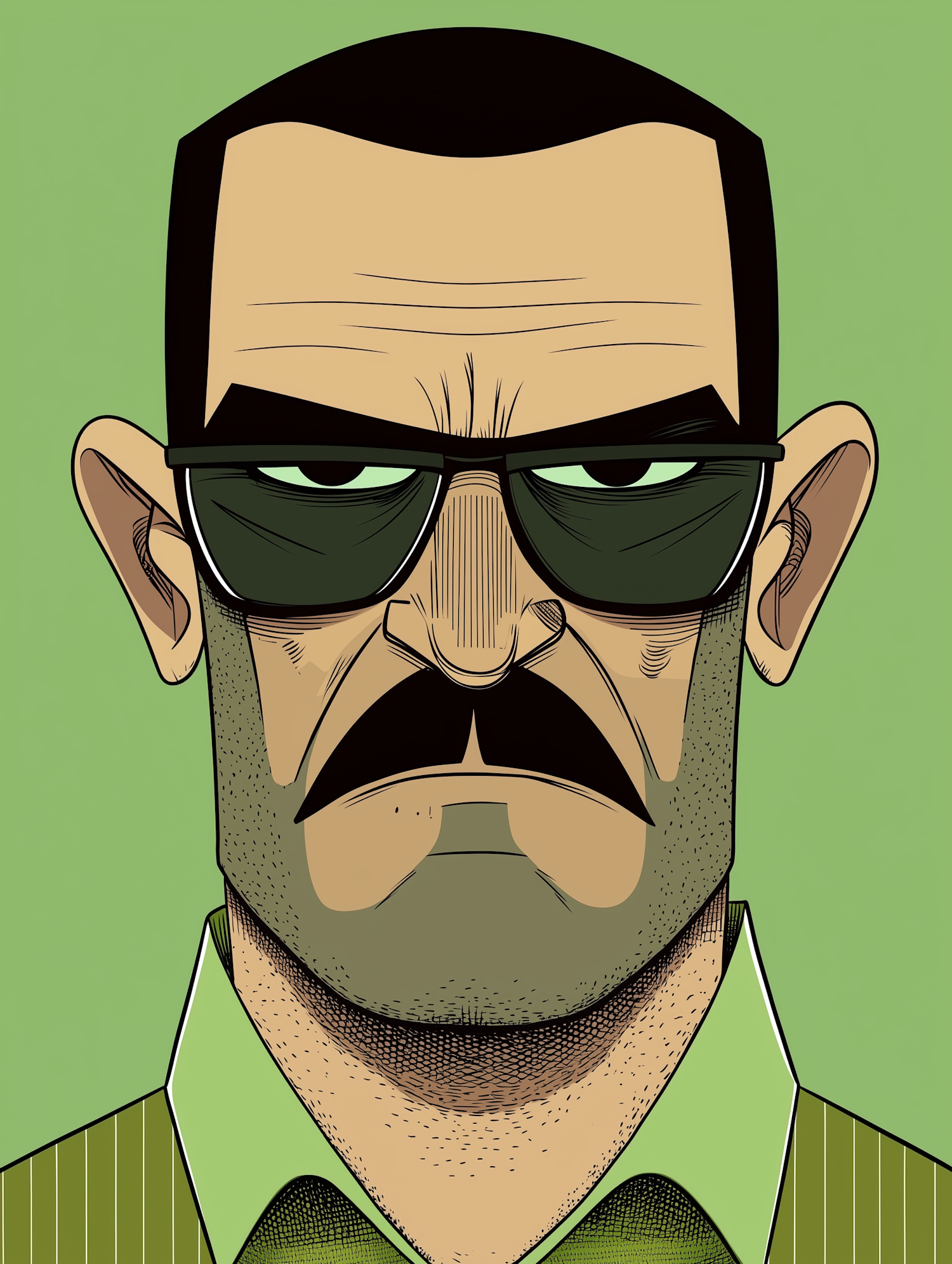 Cartoon illustration of a serious man with sunglasses, mustache, and green shirt on a solid green background. Bold, graphic novel style.